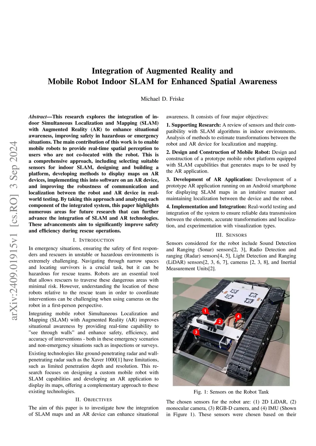 This research explores the integration of indoor Simultaneous Localization and Mapping (SLAM) with Augmented Reality (AR) to enhance situational awareness, improving safety in hazardous or emergency situations. The main contribution of this work is to enable mobile robots to provide real-time spatial perception to users who are not co-located with the robot. This is a comprehensive approach, including selecting suitable sensors for indoor SLAM, designing and building a platform, developing methods to display maps on AR devices, implementing this into software on an AR device, and improving the robustness of communication and localization between the robot and AR device in real-world testing. By taking this approach and analyzing each component of the integrated system, this paper highlights numerous areas for future research that can further advance the integration of SLAM and AR technologies. These advancements aim to significantly improve safety and efficiency during rescue operations.