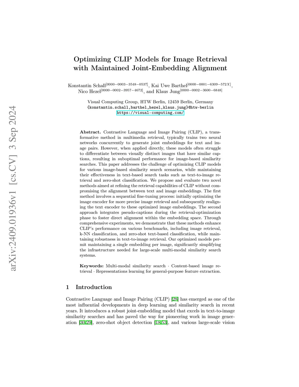 Contrastive Language and Image Pairing (CLIP), a transformative method in multimedia retrieval, typically trains two neural networks concurrently to generate joint embeddings for text and image pairs. However, when applied directly, these models often struggle to differentiate between visually distinct images that have similar captions, resulting in suboptimal performance for image-based similarity searches. This paper addresses the challenge of optimizing CLIP models for various image-based similarity search scenarios, while maintaining their effectiveness in text-based search tasks such as text-to-image retrieval and zero-shot classification. We propose and evaluate two novel methods aimed at refining the retrieval capabilities of CLIP without compromising the alignment between text and image embeddings. The first method involves a sequential fine-tuning process: initially optimizing the image encoder for more precise image retrieval and subsequently realigning the text encoder to these optimized image embeddings. The second approach integrates pseudo-captions during the retrieval-optimization phase to foster direct alignment within the embedding space. Through comprehensive experiments, we demonstrate that these methods enhance CLIP's performance on various benchmarks, including image retrieval, k-NN classification, and zero-shot text-based classification, while maintaining robustness in text-to-image retrieval. Our optimized models permit maintaining a single embedding per image, significantly simplifying the infrastructure needed for large-scale multi-modal similarity search systems.