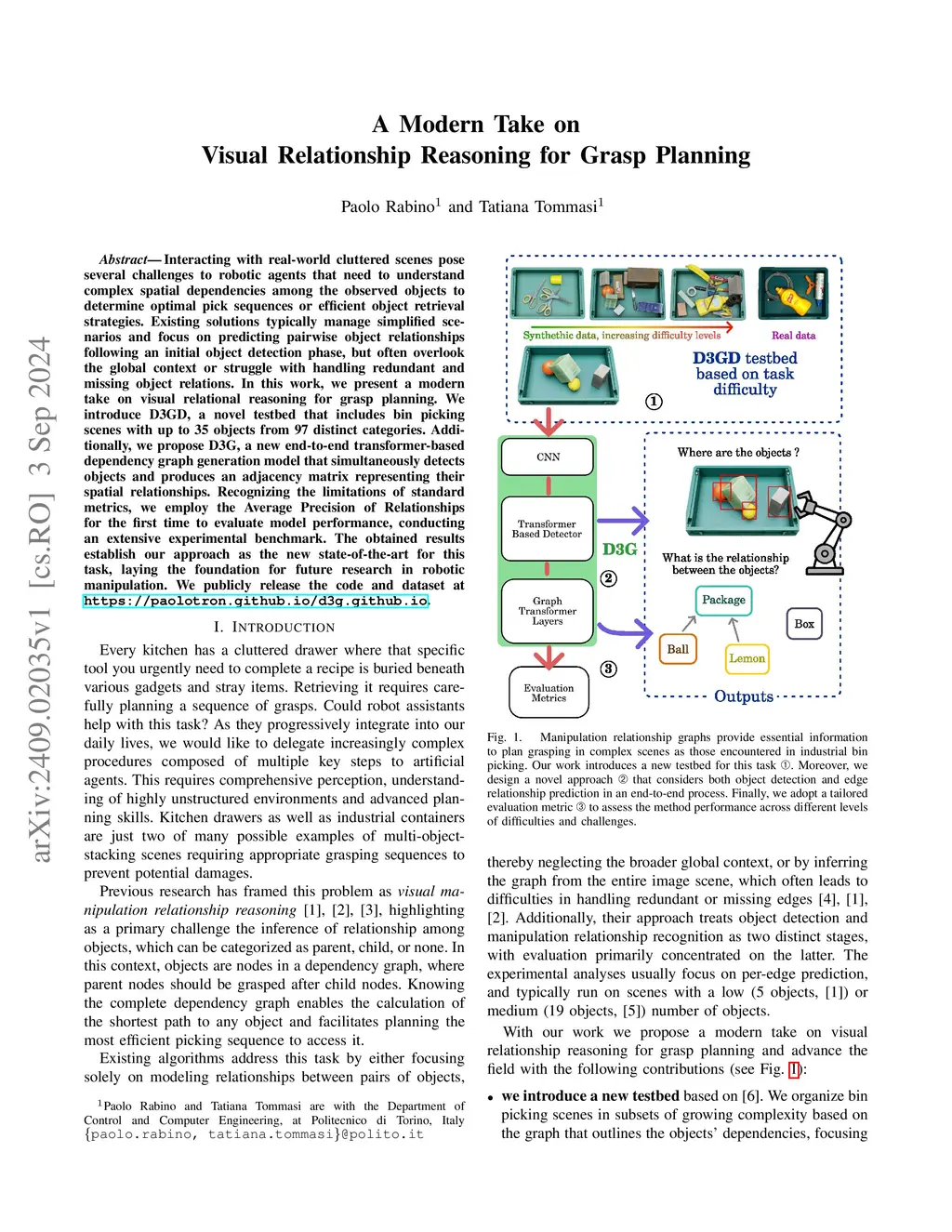 Interacting with real-world cluttered scenes pose several challenges to robotic agents that need to understand complex spatial dependencies among the observed objects to determine optimal pick sequences or efficient object retrieval strategies. Existing solutions typically manage simplified scenarios and focus on predicting pairwise object relationships following an initial object detection phase, but often overlook the global context or struggle with handling redundant and missing object relations. In this work, we present a modern take on visual relational reasoning for grasp planning. We introduce D3GD, a novel testbed that includes bin picking scenes with up to 35 objects from 97 distinct categories. Additionally, we propose D3G, a new end-to-end transformer-based dependency graph generation model that simultaneously detects objects and produces an adjacency matrix representing their spatial relationships. Recognizing the limitations of standard metrics, we employ the Average Precision of Relationships for the first time to evaluate model performance, conducting an extensive experimental benchmark. The obtained results establish our approach as the new state-of-the-art for this task, laying the foundation for future research in robotic manipulation. We publicly release the code and dataset at https://paolotron.github.io/d3g.github.io.