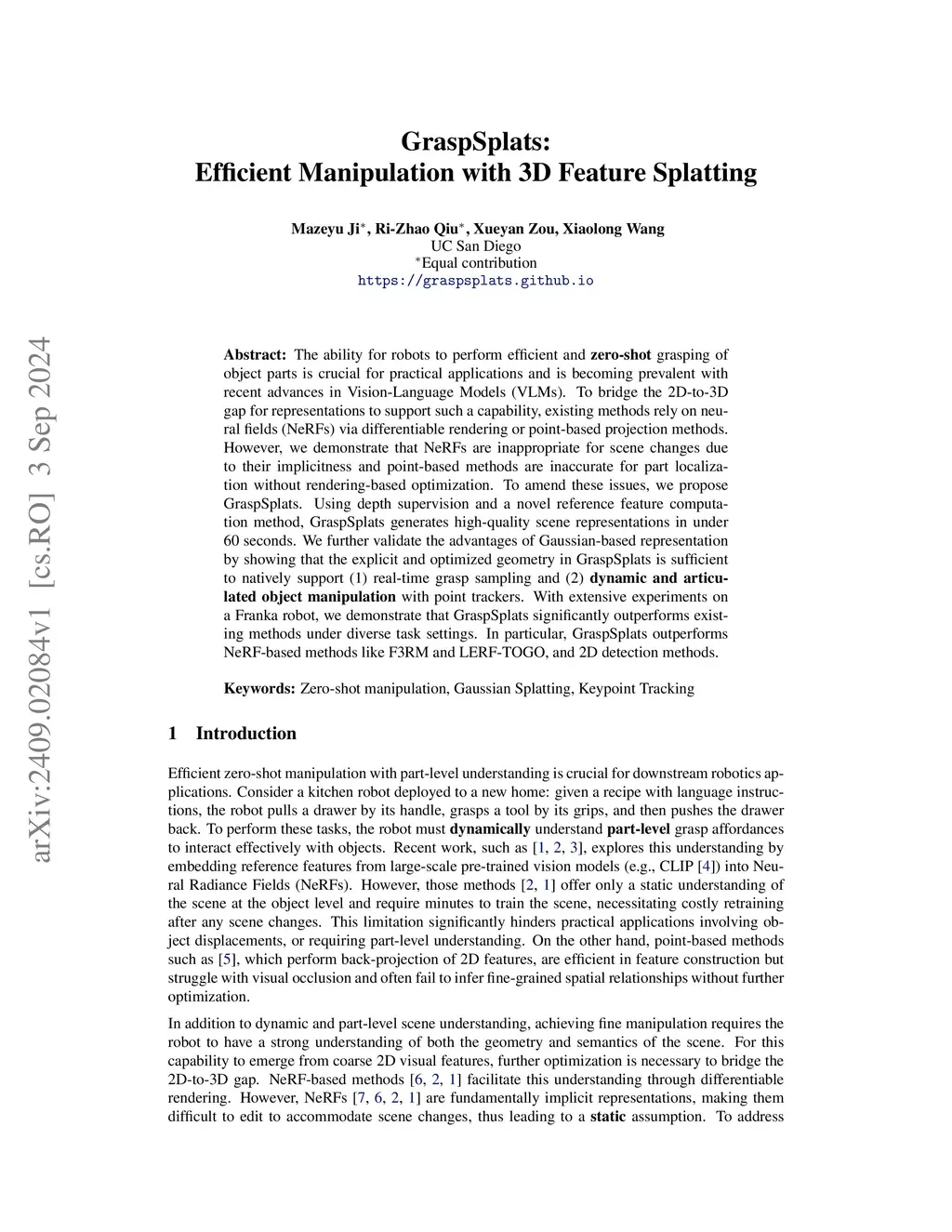 The ability for robots to perform efficient and zero-shot grasping of object parts is crucial for practical applications and is becoming prevalent with recent advances in Vision-Language Models (VLMs). To bridge the 2D-to-3D gap for representations to support such a capability, existing methods rely on neural fields (NeRFs) via differentiable rendering or point-based projection methods. However, we demonstrate that NeRFs are inappropriate for scene changes due to their implicitness and point-based methods are inaccurate for part localization without rendering-based optimization. To amend these issues, we propose GraspSplats. Using depth supervision and a novel reference feature computation method, GraspSplats generates high-quality scene representations in under 60 seconds. We further validate the advantages of Gaussian-based representation by showing that the explicit and optimized geometry in GraspSplats is sufficient to natively support (1) real-time grasp sampling and (2) dynamic and articulated object manipulation with point trackers. With extensive experiments on a Franka robot, we demonstrate that GraspSplats significantly outperforms existing methods under diverse task settings. In particular, GraspSplats outperforms NeRF-based methods like F3RM and LERF-TOGO, and 2D detection methods.