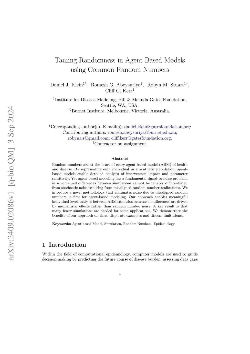 Random numbers are at the heart of every agent-based model (ABM) of health and disease. By representing each individual in a synthetic population, agent-based models enable detailed analysis of intervention impact and parameter sensitivity. Yet agent-based modeling has a fundamental signal-to-noise problem, in which small changes between simulations cannot be reliably differentiated from stochastic noise resulting from misaligned random number realizations. We introduce a novel methodology that eliminates noise due to misaligned random numbers, a first for agent-based modeling. Our approach enables meaningful individual-level analysis between ABM scenarios because all differences are driven by mechanistic effects rather than random number noise. We demonstrate the benefits of our approach on three disparate examples. Results consistently show reductions in the number of simulations required to achieve a given standard error with levels exceeding 10-fold for some applications.