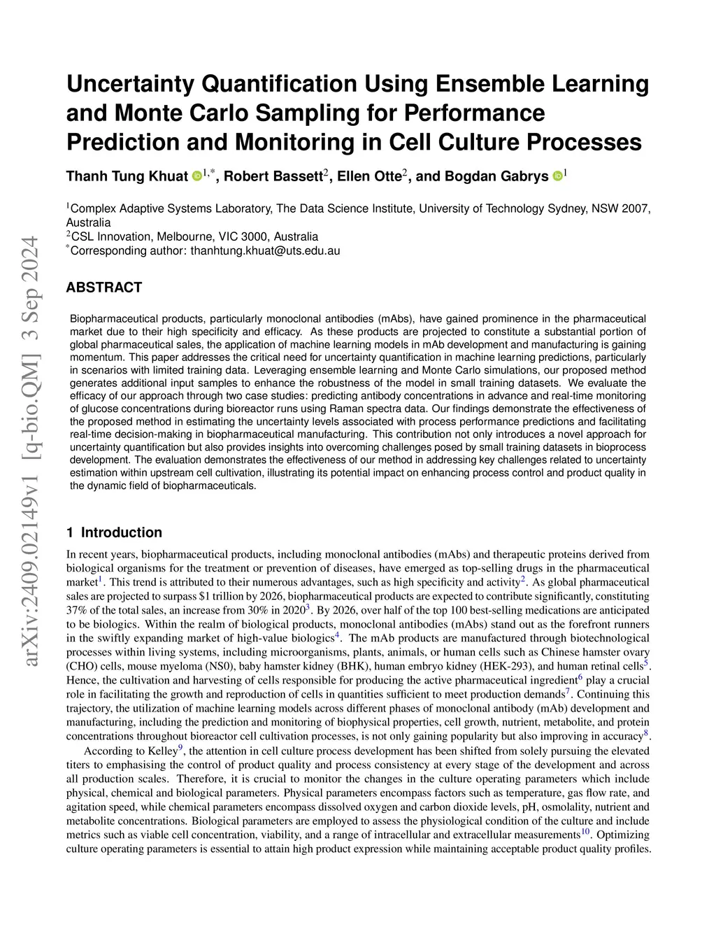 Biopharmaceutical products, particularly monoclonal antibodies (mAbs), have gained prominence in the pharmaceutical market due to their high specificity and efficacy. As these products are projected to constitute a substantial portion of global pharmaceutical sales, the application of machine learning models in mAb development and manufacturing is gaining momentum. This paper addresses the critical need for uncertainty quantification in machine learning predictions, particularly in scenarios with limited training data. Leveraging ensemble learning and Monte Carlo simulations, our proposed method generates additional input samples to enhance the robustness of the model in small training datasets. We evaluate the efficacy of our approach through two case studies: predicting antibody concentrations in advance and real-time monitoring of glucose concentrations during bioreactor runs using Raman spectra data. Our findings demonstrate the effectiveness of the proposed method in estimating the uncertainty levels associated with process performance predictions and facilitating real-time decision-making in biopharmaceutical manufacturing. This contribution not only introduces a novel approach for uncertainty quantification but also provides insights into overcoming challenges posed by small training datasets in bioprocess development. The evaluation demonstrates the effectiveness of our method in addressing key challenges related to uncertainty estimation within upstream cell cultivation, illustrating its potential impact on enhancing process control and product quality in the dynamic field of biopharmaceuticals.