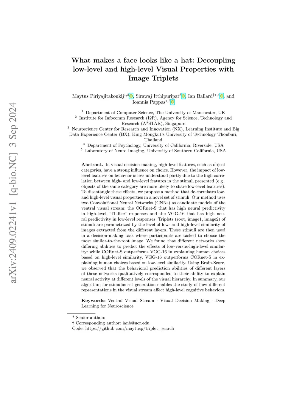 In visual decision making, high-level features, such as object categories, have a strong influence on choice. However, the impact of low-level features on behavior is less understood partly due to the high correlation between high- and low-level features in the stimuli presented (e.g., objects of the same category are more likely to share low-level features). To disentangle these effects, we propose a method that de-correlates low- and high-level visual properties in a novel set of stimuli. Our method uses two Convolutional Neural Networks (CNNs) as candidate models of the ventral visual stream: the CORnet-S that has high neural predictivity in high-level, IT-like responses and the VGG-16 that has high neural predictivity in low-level responses. Triplets (root, image1, image2) of stimuli are parametrized by the level of low- and high-level similarity of images extracted from the different layers. These stimuli are then used in a decision-making task where participants are tasked to choose the most similar-to-the-root image. We found that different networks show differing abilities to predict the effects of low-versus-high-level similarity: while CORnet-S outperforms VGG-16 in explaining human choices based on high-level similarity, VGG-16 outperforms CORnet-S in explaining human choices based on low-level similarity. Using Brain-Score, we observed that the behavioral prediction abilities of different layers of these networks qualitatively corresponded to their ability to explain neural activity at different levels of the visual hierarchy. In summary, our algorithm for stimulus set generation enables the study of how different representations in the visual stream affect high-level cognitive behaviors.