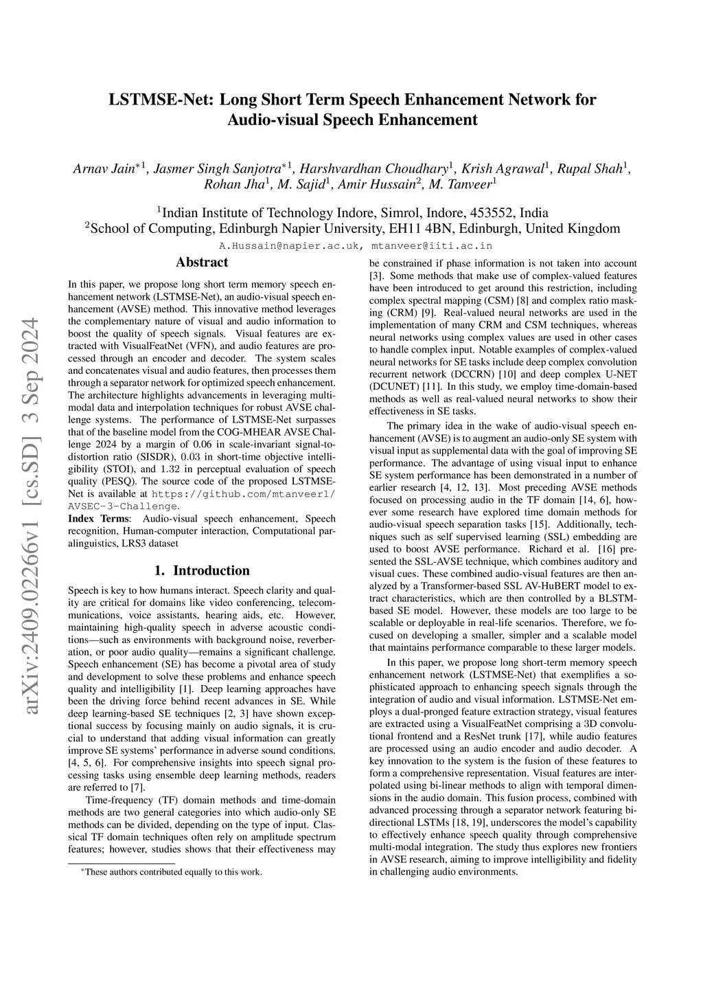 In this paper, we propose long short term memory speech enhancement network (LSTMSE-Net), an audio-visual speech enhancement (AVSE) method. This innovative method leverages the complementary nature of visual and audio information to boost the quality of speech signals. Visual features are extracted with VisualFeatNet (VFN), and audio features are processed through an encoder and decoder. The system scales and concatenates visual and audio features, then processes them through a separator network for optimized speech enhancement. The architecture highlights advancements in leveraging multi-modal data and interpolation techniques for robust AVSE challenge systems. The performance of LSTMSE-Net surpasses that of the baseline model from the COG-MHEAR AVSE Challenge 2024 by a margin of 0.06 in scale-invariant signal-to-distortion ratio (SISDR), in short-time objective intelligibility (STOI), and in perceptual evaluation of speech quality (PESQ). The source code of the proposed LSTMSE-Net is available at \url{https://github.com/mtanveer1/AVSEC-3-Challenge}.