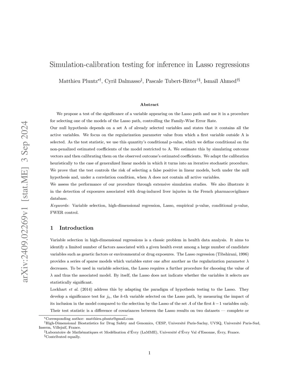 We propose a test of the significance of a variable appearing on the Lasso path and use it in a procedure for selecting one of the models of the Lasso path, controlling the Family-Wise Error Rate. Our null hypothesis depends on a set A of already selected variables and states that it contains all the active variables. We focus on the regularization parameter value from which a first variable outside A is selected. As the test statistic, we use this quantity's conditional p-value, which we define conditional on the non-penalized estimated coefficients of the model restricted to A. We estimate this by simulating outcome vectors and then calibrating them on the observed outcome's estimated coefficients. We adapt the calibration heuristically to the case of generalized linear models in which it turns into an iterative stochastic procedure. We prove that the test controls the risk of selecting a false positive in linear models, both under the null hypothesis and, under a correlation condition, when A does not contain all active variables. We assess the performance of our procedure through extensive simulation studies. We also illustrate it in the detection of exposures associated with drug-induced liver injuries in the French pharmacovigilance database.