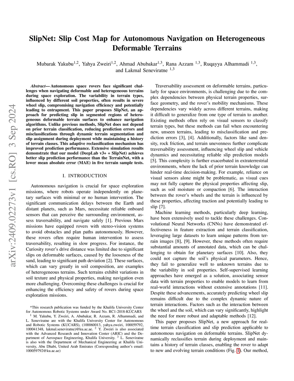 Autonomous space rovers face significant challenges when navigating deformable and heterogeneous terrains due to variability in soil properties, which can lead to severe wheel slip, compromising navigation efficiency and increasing the risk of entrapment. To address this problem, we introduce SlipNet, a novel approach for predicting wheel slip in segmented regions of diverse terrain surfaces without relying on prior terrain classification. SlipNet employs dynamic terrain segmentation and slip assignment techniques on previously unseen data, enhancing rover navigation capabilities in uncertain environments. We developed a synthetic data generation framework using the high-fidelity Vortex Studio simulator to create realistic datasets that replicate a wide range of deformable terrain conditions for training and evaluation. Extensive simulation results demonstrate that our model, combining DeepLab v3+ with SlipNet, significantly outperforms the state-of-the-art TerrainNet method, achieving lower mean absolute error (MAE) across five distinct terrain samples. These findings highlight the effectiveness of SlipNet in improving rover navigation in challenging terrains.