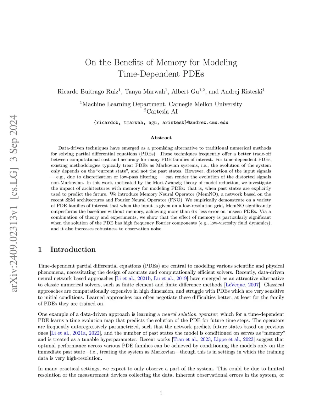 Data-driven techniques have emerged as a promising alternative to traditional numerical methods for solving PDEs. For time-dependent PDEs, many approaches are Markovian -- the evolution of the trained system only depends on the current state, and not the past states. In this work, we investigate the benefits of using memory for modeling time-dependent PDEs: that is, when past states are explicitly used to predict the future. Motivated by the Mori-Zwanzig theory of model reduction, we theoretically exhibit examples of simple (even linear) PDEs, in which a solution that uses memory is arbitrarily better than a Markovian solution. Additionally, we introduce Memory Neural Operator (MemNO), a neural operator architecture that combines recent state space models (specifically, S4) and Fourier Neural Operators (FNOs) to effectively model memory. We empirically demonstrate that when the PDEs are supplied in low resolution or contain observation noise at train and test time, MemNO significantly outperforms the baselines without memory -- with up to 6x reduction in test error. Furthermore, we show that this benefit is particularly pronounced when the PDE solutions have significant high-frequency Fourier modes (e.g., low-viscosity fluid dynamics) and we construct a challenging benchmark dataset consisting of such PDEs.