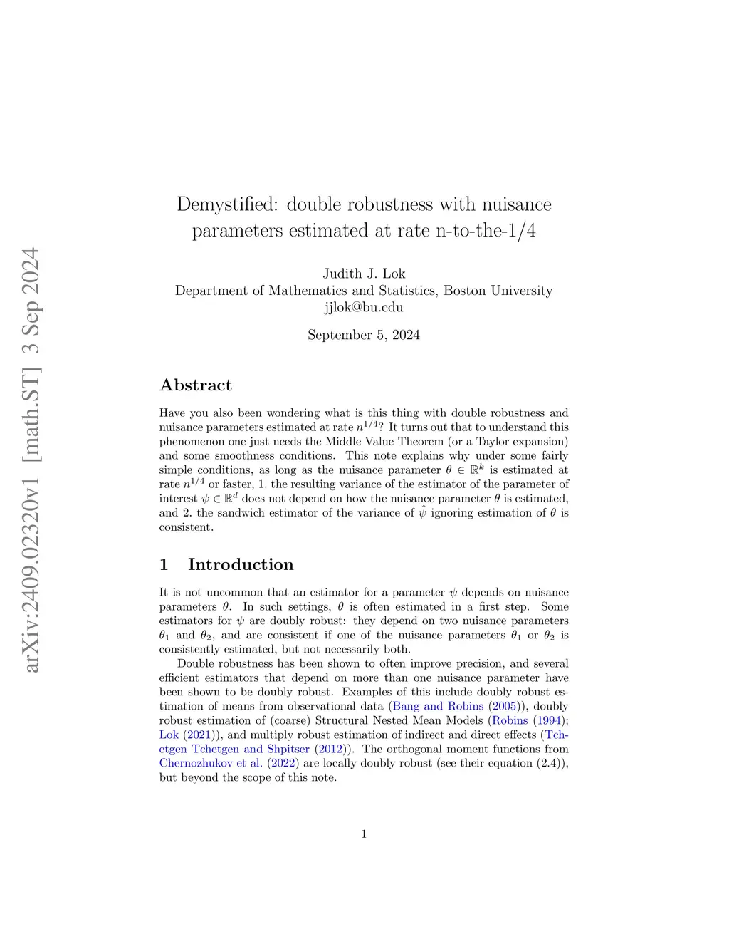 Have you also been wondering what is this thing with double robustness and nuisance parameters estimated at rate n^(1/4)? It turns out that to understand this phenomenon one just needs the Middle Value Theorem (or a Taylor expansion) and some smoothness conditions. This note explains why under some fairly simple conditions, as long as the nuisance parameter theta in R^k is estimated at rate n^(1/4) or faster, 1. the resulting variance of the estimator of the parameter of interest psi in R^d does not depend on how the nuisance parameter theta is estimated, and 2. the sandwich estimator of the variance of psi-hat ignoring estimation of theta is consistent.