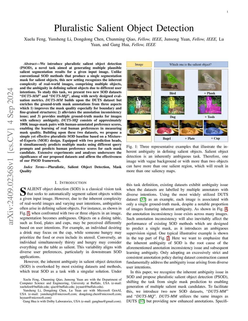 We introduce pluralistic salient object detection (PSOD), a novel task aimed at generating multiple plausible salient segmentation results for a given input image. Unlike conventional SOD methods that produce a single segmentation mask for salient objects, this new setting recognizes the inherent complexity of real-world images, comprising multiple objects, and the ambiguity in defining salient objects due to different user intentions. To study this task, we present two new SOD datasets "DUTS-MM" and "DUS-MQ", along with newly designed evaluation metrics. DUTS-MM builds upon the DUTS dataset but enriches the ground-truth mask annotations from three aspects which 1) improves the mask quality especially for boundary and fine-grained structures; 2) alleviates the annotation inconsistency issue; and 3) provides multiple ground-truth masks for images with saliency ambiguity. DUTS-MQ consists of approximately 100K image-mask pairs with human-annotated preference scores, enabling the learning of real human preferences in measuring mask quality. Building upon these two datasets, we propose a simple yet effective pluralistic SOD baseline based on a Mixture-of-Experts (MOE) design. Equipped with two prediction heads, it simultaneously predicts multiple masks using different query prompts and predicts human preference scores for each mask candidate. Extensive experiments and analyses underscore the significance of our proposed datasets and affirm the effectiveness of our PSOD framework.