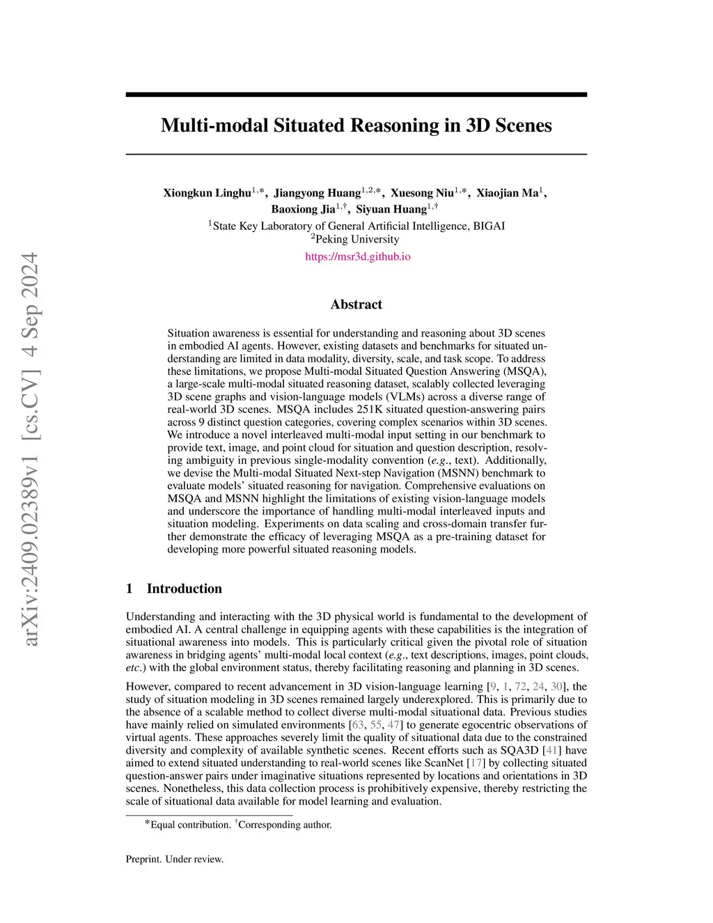 Situation awareness is essential for understanding and reasoning about 3D scenes in embodied AI agents. However, existing datasets and benchmarks for situated understanding are limited in data modality, diversity, scale, and task scope. To address these limitations, we propose Multi-modal Situated Question Answering (MSQA), a large-scale multi-modal situated reasoning dataset, scalably collected leveraging 3D scene graphs and vision-language models (VLMs) across a diverse range of real-world 3D scenes. MSQA includes 251K situated question-answering pairs across 9 distinct question categories, covering complex scenarios within 3D scenes. We introduce a novel interleaved multi-modal input setting in our benchmark to provide text, image, and point cloud for situation and question description, resolving ambiguity in previous single-modality convention (e.g., text). Additionally, we devise the Multi-modal Situated Next-step Navigation (MSNN) benchmark to evaluate models' situated reasoning for navigation. Comprehensive evaluations on MSQA and MSNN highlight the limitations of existing vision-language models and underscore the importance of handling multi-modal interleaved inputs and situation modeling. Experiments on data scaling and cross-domain transfer further demonstrate the efficacy of leveraging MSQA as a pre-training dataset for developing more powerful situated reasoning models.