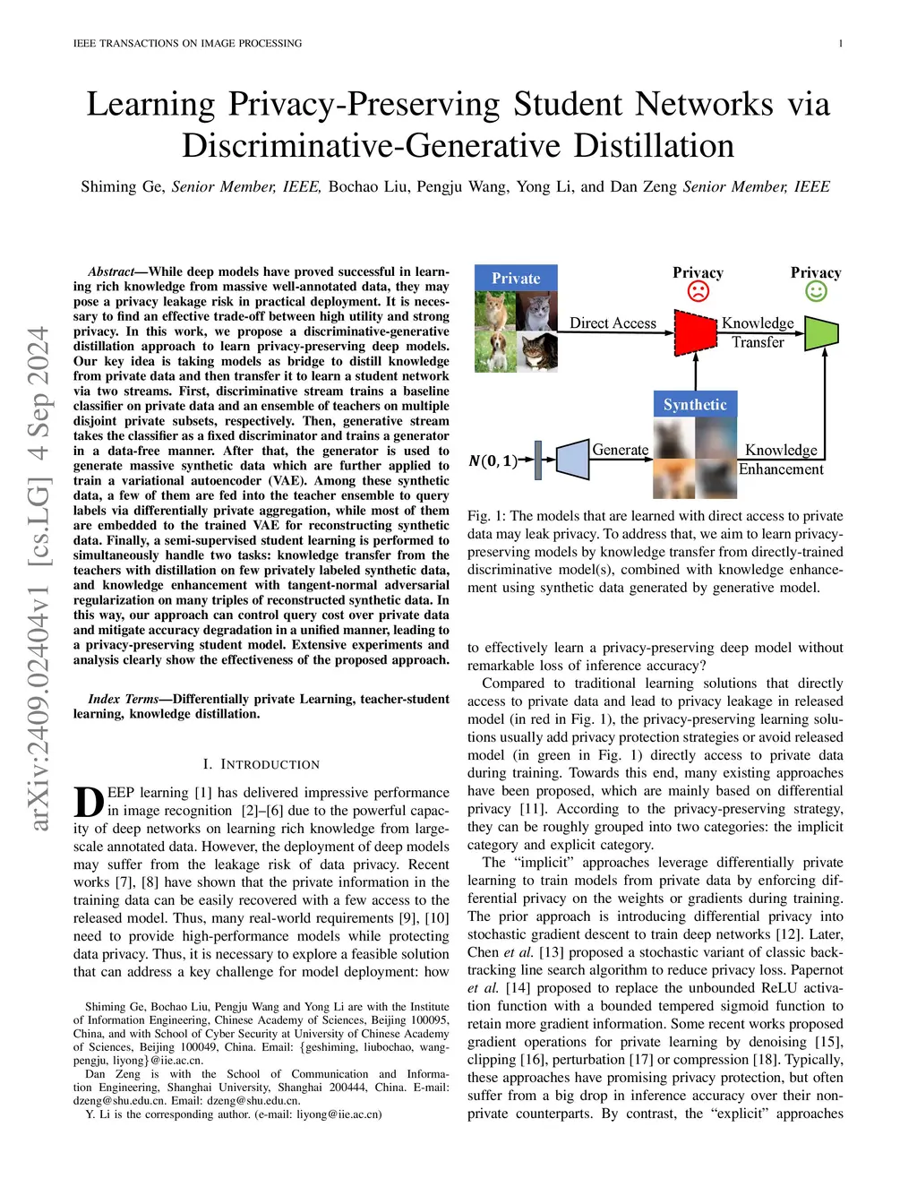 While deep models have proved successful in learning rich knowledge from massive well-annotated data, they may pose a privacy leakage risk in practical deployment. It is necessary to find an effective trade-off between high utility and strong privacy. In this work, we propose a discriminative-generative distillation approach to learn privacy-preserving deep models. Our key idea is taking models as bridge to distill knowledge from private data and then transfer it to learn a student network via two streams. First, discriminative stream trains a baseline classifier on private data and an ensemble of teachers on multiple disjoint private subsets, respectively. Then, generative stream takes the classifier as a fixed discriminator and trains a generator in a data-free manner. After that, the generator is used to generate massive synthetic data which are further applied to train a variational autoencoder (VAE). Among these synthetic data, a few of them are fed into the teacher ensemble to query labels via differentially private aggregation, while most of them are embedded to the trained VAE for reconstructing synthetic data. Finally, a semi-supervised student learning is performed to simultaneously handle two tasks: knowledge transfer from the teachers with distillation on few privately labeled synthetic data, and knowledge enhancement with tangent-normal adversarial regularization on many triples of reconstructed synthetic data. In this way, our approach can control query cost over private data and mitigate accuracy degradation in a unified manner, leading to a privacy-preserving student model. Extensive experiments and analysis clearly show the effectiveness of the proposed approach.