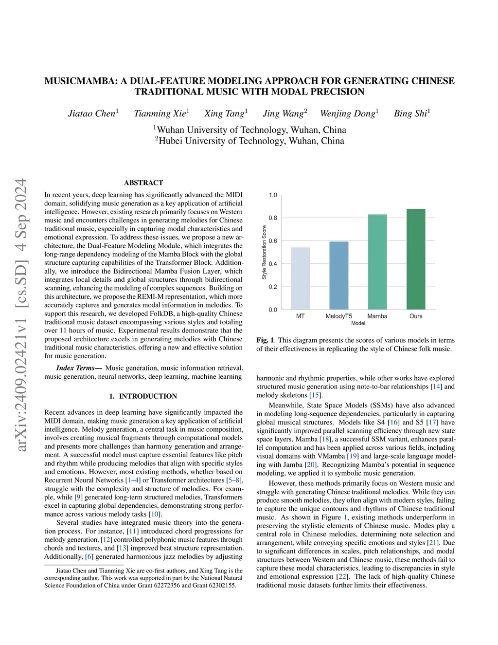 In recent years, deep learning has significantly advanced the MIDI domain, solidifying music generation as a key application of artificial intelligence. However, existing research primarily focuses on Western music and encounters challenges in generating melodies for Chinese traditional music, especially in capturing modal characteristics and emotional expression. To address these issues, we propose a new architecture, the Dual-Feature Modeling Module, which integrates the long-range dependency modeling of the Mamba Block with the global structure capturing capabilities of the Transformer Block. Additionally, we introduce the Bidirectional Mamba Fusion Layer, which integrates local details and global structures through bidirectional scanning, enhancing the modeling of complex sequences. Building on this architecture, we propose the REMI-M representation, which more accurately captures and generates modal information in melodies. To support this research, we developed FolkDB, a high-quality Chinese traditional music dataset encompassing various styles and totaling over 11 hours of music. Experimental results demonstrate that the proposed architecture excels in generating melodies with Chinese traditional music characteristics, offering a new and effective solution for music generation.
