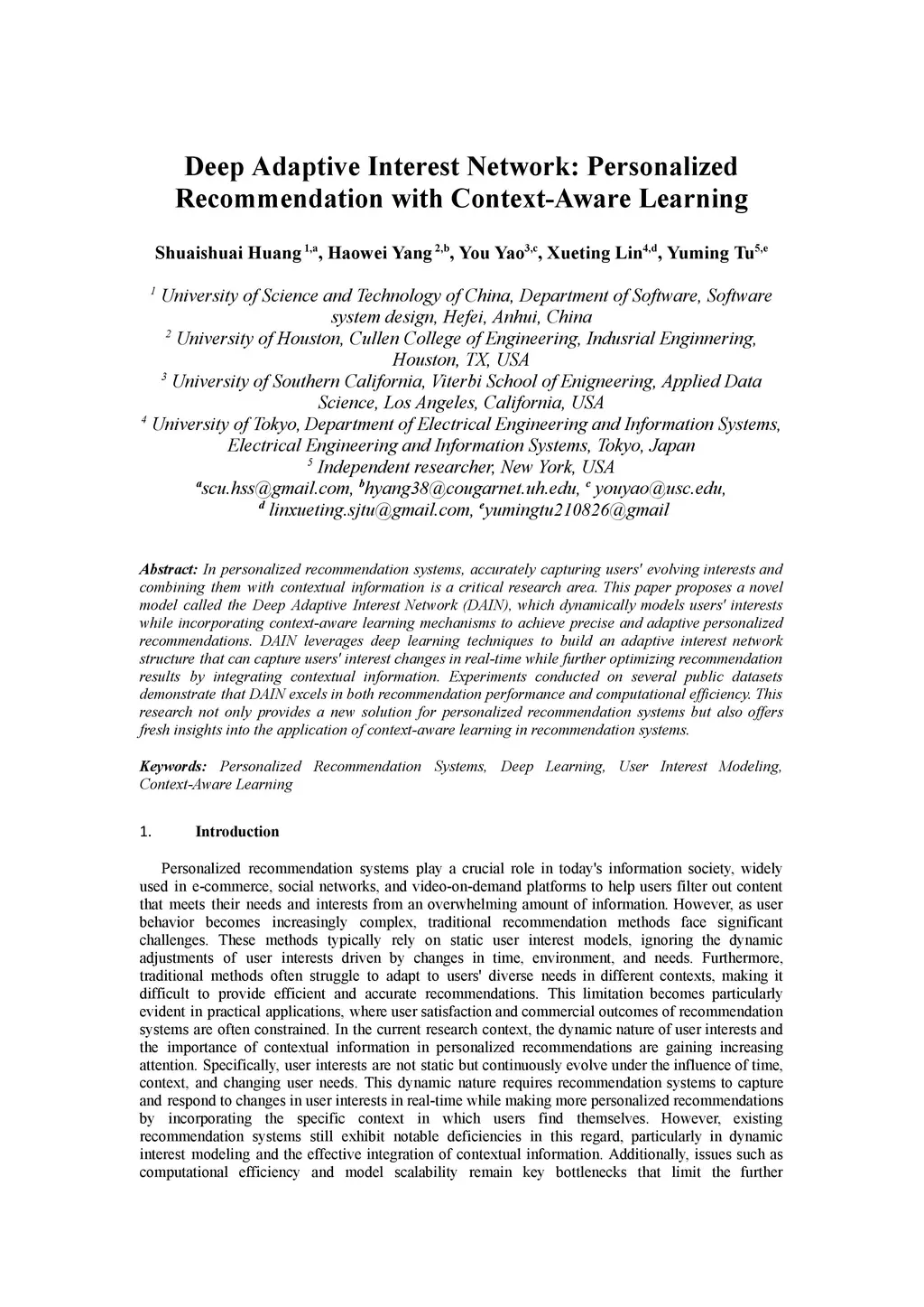 In personalized recommendation systems, accurately capturing users' evolving interests and combining them with contextual information is a critical research area. This paper proposes a novel model called the Deep Adaptive Interest Network (DAIN), which dynamically models users' interests while incorporating context-aware learning mechanisms to achieve precise and adaptive personalized recommendations. DAIN leverages deep learning techniques to build an adaptive interest network structure that can capture users' interest changes in real-time while further optimizing recommendation results by integrating contextual information. Experiments conducted on several public datasets demonstrate that DAIN excels in both recommendation performance and computational efficiency. This research not only provides a new solution for personalized recommendation systems but also offers fresh insights into the application of context-aware learning in recommendation systems.