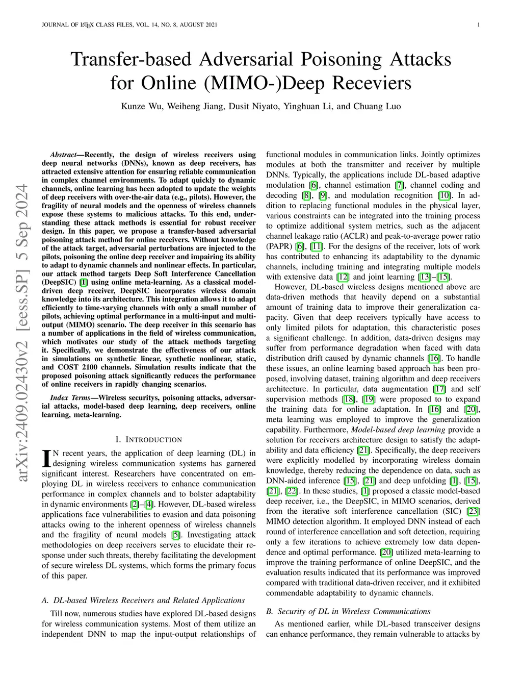 Recently, the design of wireless receivers using deep neural networks (DNNs), known as deep receivers, has attracted extensive attention for ensuring reliable communication in complex channel environments. To adapt quickly to dynamic channels, online learning has been adopted to update the weights of deep receivers with over-the-air data (e.g., pilots). However, the fragility of neural models and the openness of wireless channels expose these systems to malicious attacks. To this end, understanding these attack methods is essential for robust receiver design. In this paper, we propose a transfer-based adversarial poisoning attack method for online receivers. Without knowledge of the attack target, adversarial perturbations are injected to the pilots, poisoning the online deep receiver and impairing its ability to adapt to dynamic channels and nonlinear effects. In particular, our attack method targets Deep Soft Interference Cancellation (DeepSIC)[1] using online meta-learning. As a classical model-driven deep receiver, DeepSIC incorporates wireless domain knowledge into its architecture. This integration allows it to adapt efficiently to time-varying channels with only a small number of pilots, achieving optimal performance in a multi-input and multi-output (MIMO) scenario. The deep receiver in this scenario has a number of applications in the field of wireless communication, which motivates our study of the attack methods targeting it. Specifically, we demonstrate the effectiveness of our attack in simulations on synthetic linear, synthetic nonlinear, static, and COST 2100 channels. Simulation results indicate that the proposed poisoning attack significantly reduces the performance of online receivers in rapidly changing scenarios.