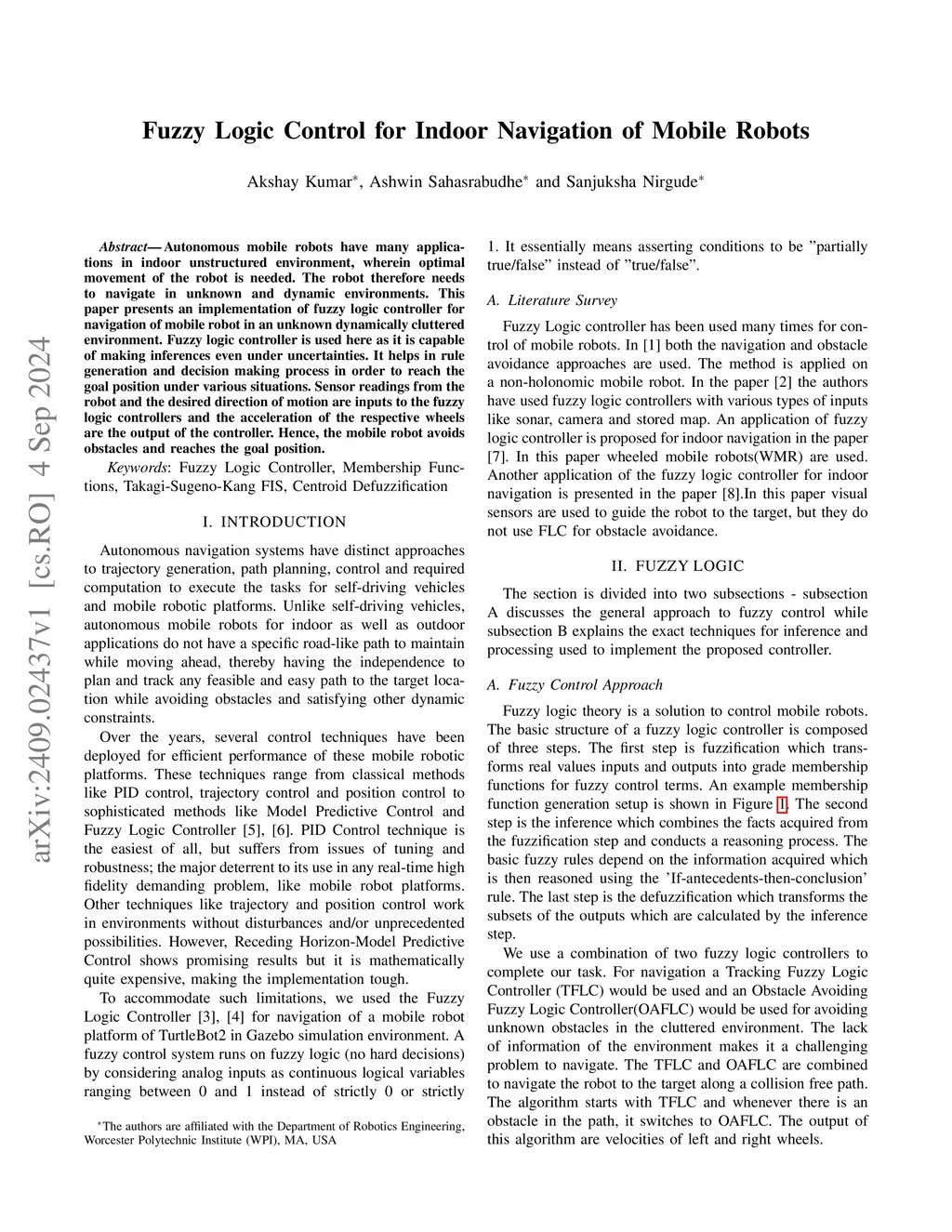 Fuzzy Logic Control for Indoor Navigation of Mobile Robots
