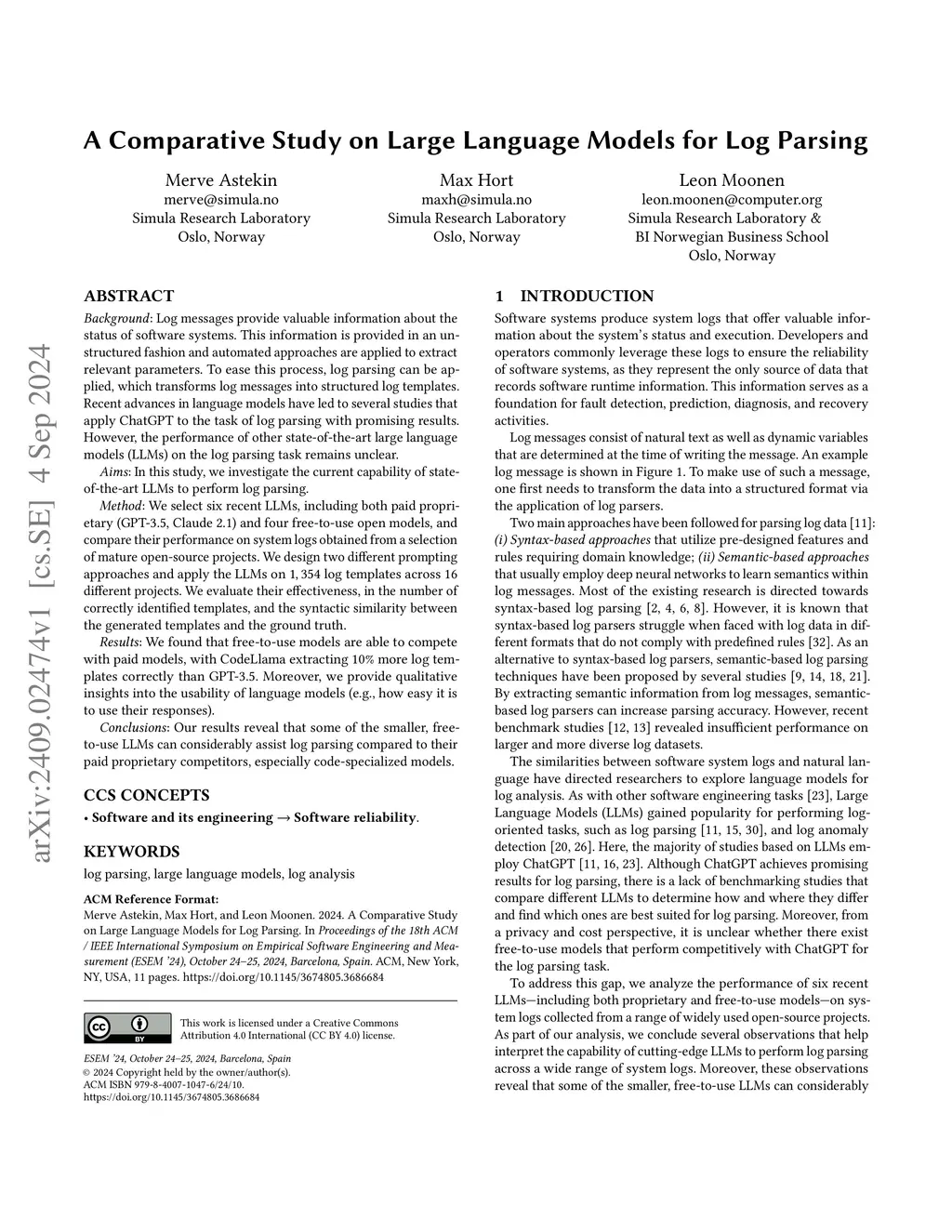 Background: Log messages provide valuable information about the status of software systems. This information is provided in an unstructured fashion and automated approaches are applied to extract relevant parameters. To ease this process, log parsing can be applied, which transforms log messages into structured log templates. Recent advances in language models have led to several studies that apply ChatGPT to the task of log parsing with promising results. However, the performance of other state-of-the-art large language models (LLMs) on the log parsing task remains unclear. Aims: In this study, we investigate the current capability of state-of-the-art LLMs to perform log parsing. Method: We select six recent LLMs, including both paid proprietary (GPT-3.5, Claude 2.1) and four free-to-use open models, and compare their performance on system logs obtained from a selection of mature open-source projects. We design two different prompting approaches and apply the LLMs on 1, 354 log templates across 16 different projects. We evaluate their effectiveness, in the number of correctly identified templates, and the syntactic similarity between the generated templates and the ground truth. Results: We found that free-to-use models are able to compete with paid models, with CodeLlama extracting 10% more log templates correctly than GPT-3.5. Moreover, we provide qualitative insights into the usability of language models (e.g., how easy it is to use their responses). Conclusions: Our results reveal that some of the smaller, free-to-use LLMs can considerably assist log parsing compared to their paid proprietary competitors, especially code-specialized models.