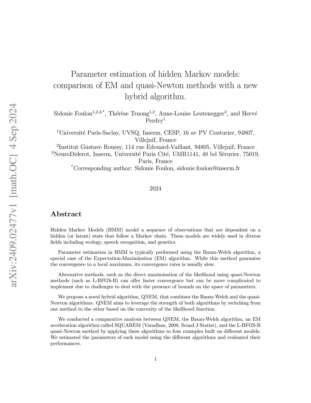 Hidden Markov Models (HMM) model a sequence of observations that are dependent on a hidden (or latent) state that follow a Markov chain. These models are widely used in diverse fields including ecology, speech recognition, and genetics.Parameter estimation in HMM is typically performed using the Baum-Welch algorithm, a special case of the Expectation-Maximisation (EM) algorithm. While this method guarantee the convergence to a local maximum, its convergence rates is usually slow.Alternative methods, such as the direct maximisation of the likelihood using quasi-Newton methods (such as L-BFGS-B) can offer faster convergence but can be more complicated to implement due to challenges to deal with the presence of bounds on the space of parameters.We propose a novel hybrid algorithm, QNEM, that combines the Baum-Welch and the quasi-Newton algorithms. QNEM aims to leverage the strength of both algorithms by switching from one method to the other based on the convexity of the likelihood function.We conducted a comparative analysis between QNEM, the Baum-Welch algorithm, an EM acceleration algorithm called SQUAREM (Varadhan, 2008, Scand J Statist), and the L-BFGS-B quasi-Newton method by applying these algorithms to four examples built on different models. We estimated the parameters of each model using the different algorithms and evaluated their performances.Our results show that the best-performing algorithm depends on the model considered. QNEM performs well overall, always being faster or equivalent to L-BFGS-B. The Baum-Welch and SQUAREM algorithms are faster than the quasi-Newton and QNEM algorithms in certain scenarios with multiple optimum. In conclusion, QNEM offers a promising alternative to existing algorithms.