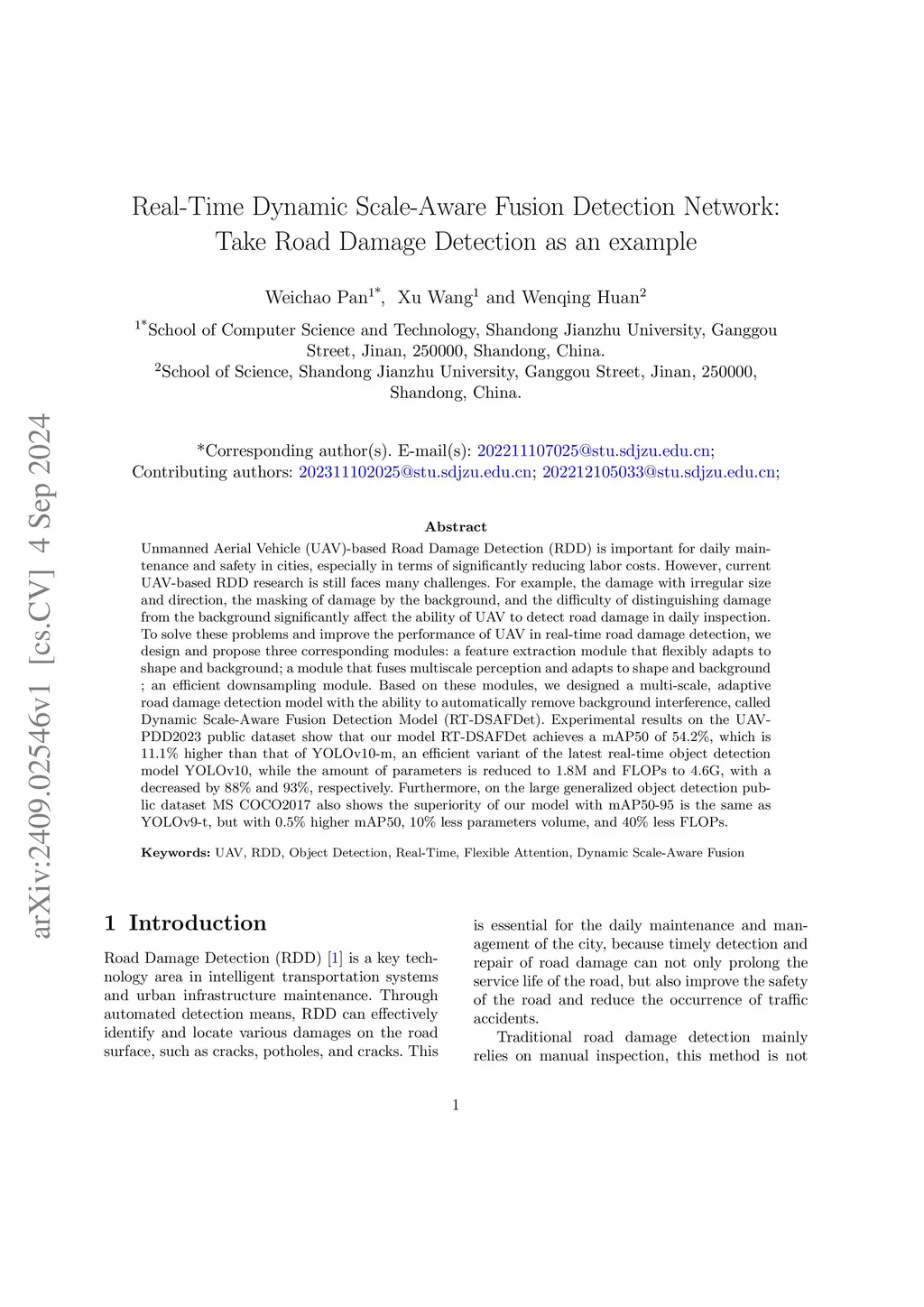 Unmanned Aerial Vehicle (UAV)-based Road Damage Detection (RDD) is important for daily maintenance and safety in cities, especially in terms of significantly reducing labor costs. However, current UAV-based RDD research is still faces many challenges. For example, the damage with irregular size and direction, the masking of damage by the background, and the difficulty of distinguishing damage from the background significantly affect the ability of UAV to detect road damage in daily inspection. To solve these problems and improve the performance of UAV in real-time road damage detection, we design and propose three corresponding modules: a feature extraction module that flexibly adapts to shape and background; a module that fuses multiscale perception and adapts to shape and background ; an efficient downsampling module. Based on these modules, we designed a multi-scale, adaptive road damage detection model with the ability to automatically remove background interference, called Dynamic Scale-Aware Fusion Detection Model (RT-DSAFDet). Experimental results on the UAV-PDD2023 public dataset show that our model RT-DSAFDet achieves a mAP50 of 54.2%, which is 11.1% higher than that of YOLOv10-m, an efficient variant of the latest real-time object detection model YOLOv10, while the amount of parameters is reduced to 1.8M and FLOPs to 4.6G, with a decreased by 88% and 93%, respectively. Furthermore, on the large generalized object detection public dataset MS COCO2017 also shows the superiority of our model with mAP50-95 is the same as YOLOv9-t, but with 0.5% higher mAP50, 10% less parameters volume, and 40% less FLOPs.