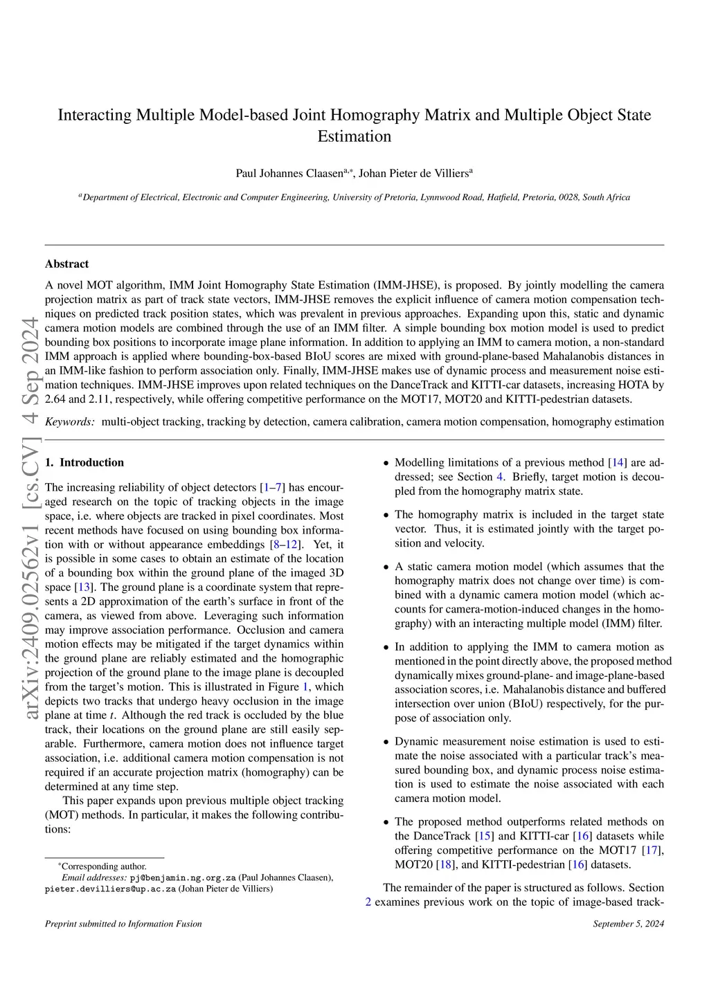 A novel online MOT algorithm, IMM Joint Homography State Estimation (IMM-JHSE), is proposed. IMM-JHSE uses an initial homography estimate as the only additional 3D information, whereas other 3D MOT methods use regular 3D measurements. By jointly modelling the homography matrix and its dynamics as part of track state vectors, IMM-JHSE removes the explicit influence of camera motion compensation techniques on predicted track position states, which was prevalent in previous approaches. Expanding upon this, static and dynamic camera motion models are combined using an IMM filter. A simple bounding box motion model is used to predict bounding box positions to incorporate image plane information. In addition to applying an IMM to camera motion, a non-standard IMM approach is applied where bounding-box-based BIoU scores are mixed with ground-plane-based Mahalanobis distances in an IMM-like fashion to perform association only, making IMM-JHSE robust to motion away from the ground plane. Finally, IMM-JHSE makes use of dynamic process and measurement noise estimation techniques. IMM-JHSE improves upon related techniques, including UCMCTrack, OC-SORT, C-BIoU and ByteTrack on the DanceTrack and KITTI-car datasets, increasing HOTA by 2.64 and 2.11, respectively, while offering competitive performance on the MOT17, MOT20 and KITTI-pedestrian datasets. Using publicly available detections, IMM-JHSE outperforms almost all other 2D MOT methods and is outperformed only by 3D MOT methods -- some of which are offline -- on the KITTI-car dataset. Compared to tracking-by-attention methods, IMM-JHSE shows remarkably similar performance on the DanceTrack dataset and outperforms them on the MOT17 dataset. The code is publicly available:this https URL.