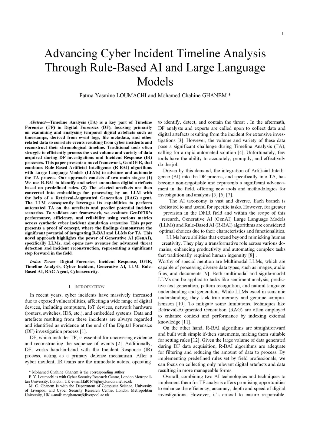 Timeline Analysis (TA) plays a crucial role in Timeline Forensics (TF) within the field of Digital Forensics (DF). It focuses on examining and analyzing time-based digital artefacts, such as timestamps derived from event logs, file metadata, and other relevant data, to correlate events linked to cyber incidents and reconstruct their chronological sequence. Traditional tools often struggle to efficiently handle the large volume and variety of data generated during DF investigations and Incident Response (IR) processes. This paper introduces a novel framework, GenDFIR, which combines Rule-Based Artificial Intelligence (R-BAI) algorithms with Large Language Models (LLMs) to enhance and automate the TA process. The proposed approach consists of two key stages: (1) R-BAI is used to identify and select anomalous digital artefacts based on predefined rules. (2) The selected artefacts are then transformed into embeddings for processing by an LLM with the assistance of a Retrieval-Augmented Generation (RAG) agent. The LLM uses its capabilities to perform automated TA on the artefacts and predict potential incident outcomes. To validate the framework, we evaluated its performance, efficiency, and reliability. Several metrics were applied to simulated cyber incident scenarios, which were presented as forensic case documents. Our findings demonstrate the significant potential of integrating R-BAI and LLMs for TA. This innovative approach underscores the power of Generative AI (GenAI), particularly LLMs, and opens up new possibilities for advanced threat detection and incident reconstruction, marking a significant advancement in the field.