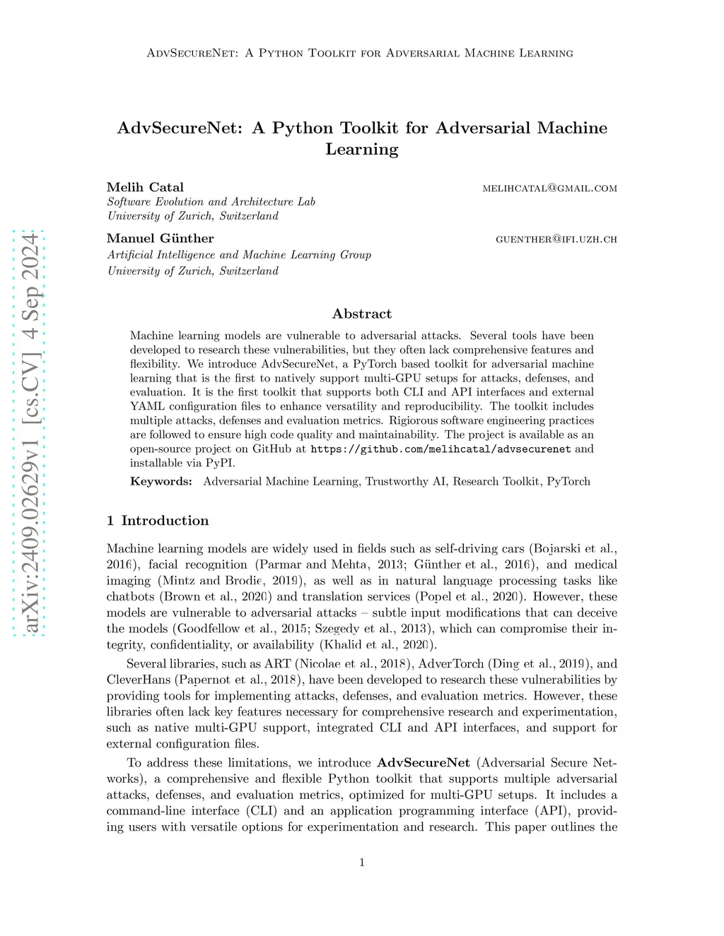 Machine learning models are vulnerable to adversarial attacks. Several tools have been developed to research these vulnerabilities, but they often lack comprehensive features and flexibility. We introduce AdvSecureNet, a PyTorch based toolkit for adversarial machine learning that is the first to natively support multi-GPU setups for attacks, defenses, and evaluation. It is the first toolkit that supports both CLI and API interfaces and external YAML configuration files to enhance versatility and reproducibility. The toolkit includes multiple attacks, defenses and evaluation metrics. Rigiorous software engineering practices are followed to ensure high code quality and maintainability. The project is available as an open-source project on GitHub at https://github.com/melihcatal/advsecurenet and installable via PyPI.