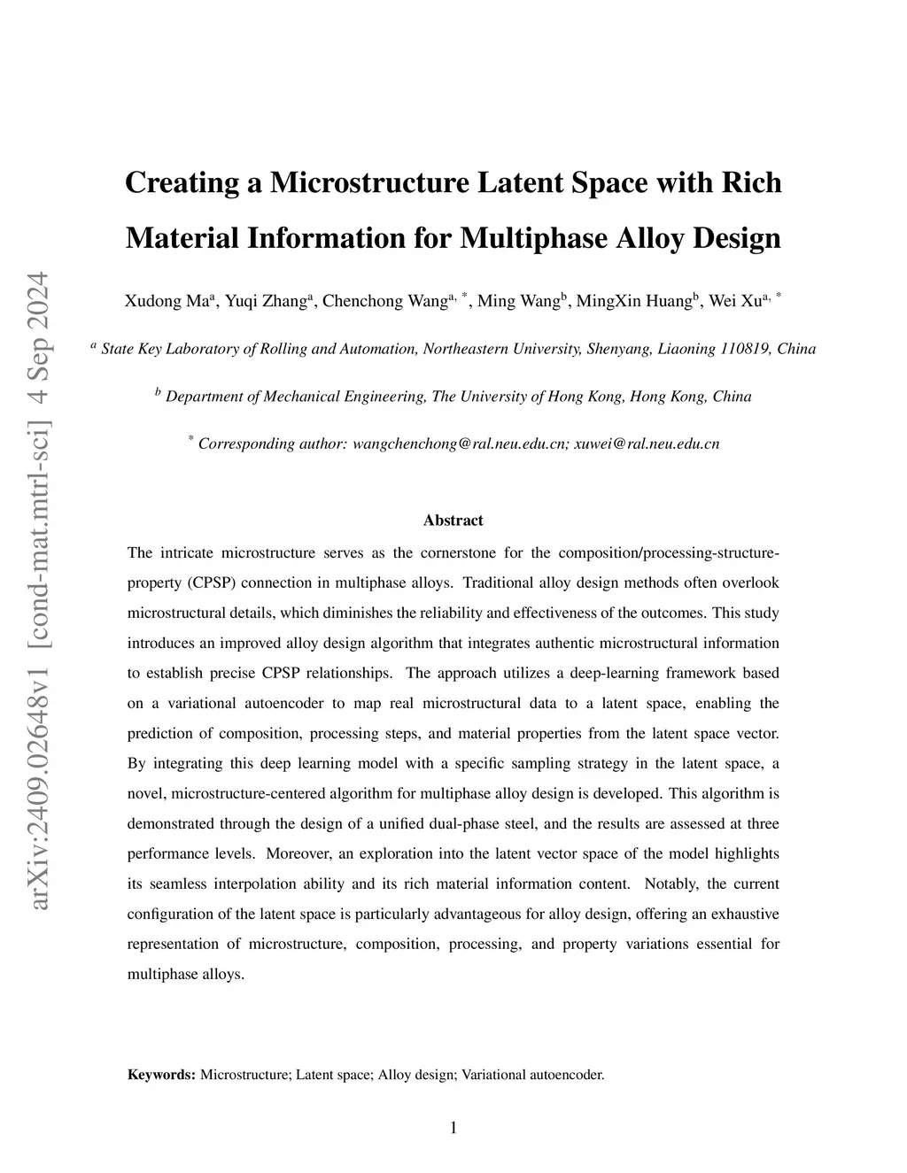 The intricate microstructure serves as the cornerstone for the composition/processing-structure-property (CPSP) connection in multiphase alloys. Traditional alloy design methods often overlook microstructural details, which diminishes the reliability and effectiveness of the outcomes. This study introduces an improved alloy design algorithm that integrates authentic microstructural information to establish precise CPSP relationships. The approach utilizes a deep-learning framework based on a variational autoencoder to map real microstructural data to a latent space, enabling the prediction of composition, processing steps, and material properties from the latent space vector. By integrating this deep learning model with a specific sampling strategy in the latent space, a novel, microstructure-centered algorithm for multiphase alloy design is developed. This algorithm is demonstrated through the design of a unified dual-phase steel, and the results are assessed at three performance levels. Moreover, an exploration into the latent vector space of the model highlights its seamless interpolation ability and its rich material information content. Notably, the current configuration of the latent space is particularly advantageous for alloy design, offering an exhaustive representation of microstructure, composition, processing, and property variations essential for multiphase alloys.