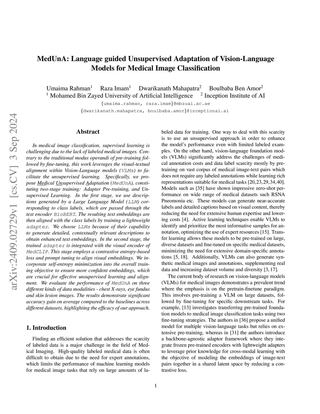 In medical image classification, supervised learning is challenging due to the scarcity of labeled medical images. To address this, we leverage the visual-textual alignment within Vision-Language Models (VLMs) to enable unsupervised learning of a medical image classifier. In this work, we propose \underline{Med}ical \underline{Un}supervised \underline{A}daptation (\texttt{MedUnA}) of VLMs, where the LLM-generated descriptions for each class are encoded into text embeddings and matched with class labels via a cross-modal adapter. This adapter attaches to a visual encoder of \texttt{MedCLIP} and aligns the visual embeddings through unsupervised learning, driven by a contrastive entropy-based loss and prompt tuning. Thereby, improving performance in scenarios where textual information is more abundant than labeled images, particularly in the healthcare domain. Unlike traditional VLMs, \texttt{MedUnA} uses \textbf{unpaired images and text} for learning representations and enhances the potential of VLMs beyond traditional constraints. We evaluate the performance on three chest X-ray datasets and two multi-class datasets (diabetic retinopathy and skin lesions), showing significant accuracy gains over the zero-shot baseline. Our code is available atthis https URL.