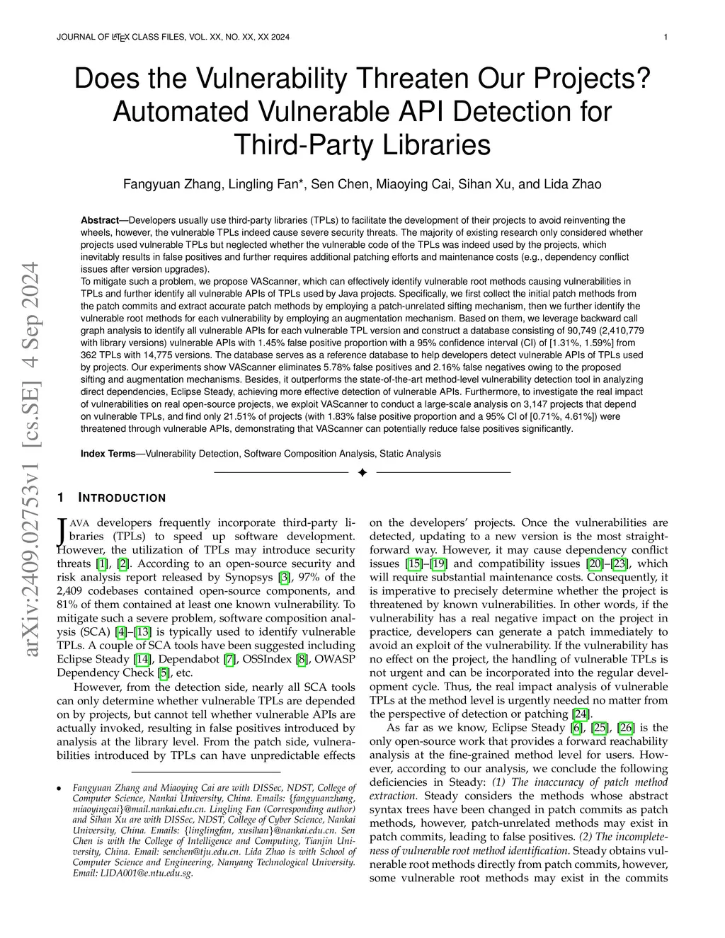 Developers usually use TPLs to facilitate the development of the projects to avoid reinventing the wheels, however, the vulnerable TPLs indeed cause severe security threats. The majority of existing research only considered whether projects used vulnerable TPLs but neglected whether the vulnerable code of the TPLs was indeed used by the projects, which inevitably results in false positives and further requires additional patching efforts and maintenance costs. To address this, we propose VAScanner, which can effectively identify vulnerable root methods causing vulnerabilities in TPLs and further identify all vulnerable APIs of TPLs used by Java projects. Specifically, we first collect the initial patch methods from the patch commits and extract accurate patch methods by employing a patch-unrelated sifting mechanism, then we further identify the vulnerable root methods for each vulnerability by employing an augmentation mechanism. Based on them, we leverage backward call graph analysis to identify all vulnerable APIs for each vulnerable TPL version and construct a database consisting of 90,749 (2,410,779 with library versions) vulnerable APIs with 1.45% false positive proportion with a 95% CI of [1.31%, 1.59%] from 362 TPLs with 14,775 versions. Our experiments show VAScanner eliminates 5.78% false positives and 2.16% false negatives owing to the proposed sifting and augmentation mechanisms. Besides, it outperforms the state-of-the-art method-level tool in analyzing direct dependencies, Eclipse Steady, achieving more effective detection of vulnerable APIs. Furthermore, in a large-scale analysis of 3,147 projects using vulnerable TPLs, we find only 21.51% of projects (with 1.83% false positive proportion and a 95% CI of [0.71%, 4.61%]) were threatened through vulnerable APIs by vulnerable TPLs, demonstrating that VAScanner can potentially reduce false positives significantly.