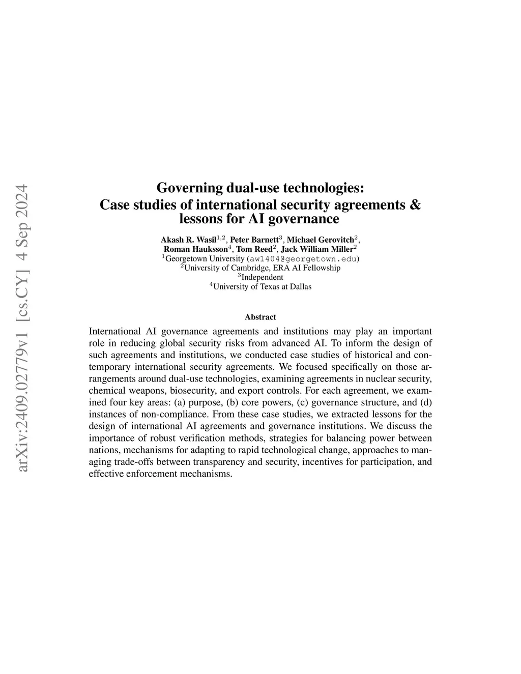 International AI governance agreements and institutions may play an important role in reducing global security risks from advanced AI. To inform the design of such agreements and institutions, we conducted case studies of historical and contemporary international security agreements. We focused specifically on those arrangements around dual-use technologies, examining agreements in nuclear security, chemical weapons, biosecurity, and export controls. For each agreement, we examined four key areas: (a) purpose, (b) core powers, (c) governance structure, and (d) instances of non-compliance. From these case studies, we extracted lessons for the design of international AI agreements and governance institutions. We discuss the importance of robust verification methods, strategies for balancing power between nations, mechanisms for adapting to rapid technological change, approaches to managing trade-offs between transparency and security, incentives for participation, and effective enforcement mechanisms.