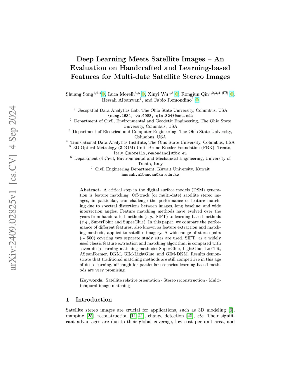A critical step in the digital surface models(DSM) generation is feature matching. Off-track (or multi-date) satellite stereo images, in particular, can challenge the performance of feature matching due to spectral distortions between images, long baseline, and wide intersection angles. Feature matching methods have evolved over the years from handcrafted methods (e.g., SIFT) to learning-based methods (e.g., SuperPoint and SuperGlue). In this paper, we compare the performance of different features, also known as feature extraction and matching methods, applied to satellite imagery. A wide range of stereo pairs(~500) covering two separate study sites are used. SIFT, as a widely used classic feature extraction and matching algorithm, is compared with seven deep-learning matching methods: SuperGlue, LightGlue, LoFTR, ASpanFormer, DKM, GIM-LightGlue, and GIM-DKM. Results demonstrate that traditional matching methods are still competitive in this age of deep learning, although for particular scenarios learning-based methods are very promising.