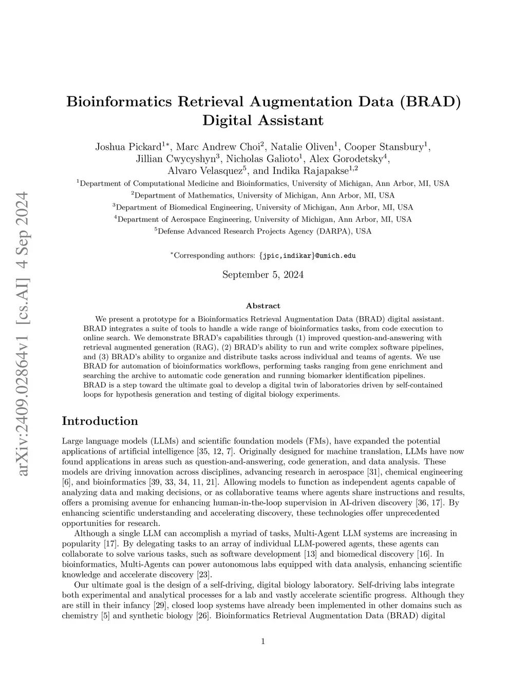 Recent advancements in Large Language Models (LLMs) are transforming biology, computer science, and many other research fields, as well as impacting everyday life. While transformer-based technologies are currently being deployed in biology, no available agentic system has been developed to tackle bioinformatics workflows. We present a prototype Bioinformatics Retrieval Augmented Data (BRAD) digital assistant. BRAD is a chatbot and agentic system that integrates a suite of tools to handle bioinformatics tasks, from code execution to online search. We demonstrate its capabilities through (1) improved question-and-answering with retrieval augmented generation (RAG), (2) the ability to run complex software pipelines, and (3) the ability to organize and distribute tasks in agentic workflows. We use BRAD for automation, performing tasks ranging from gene enrichment and searching the archive to automatic code generation for running biomarker identification pipelines. BRAD is a step toward autonomous, self-driving labs for digital biology.