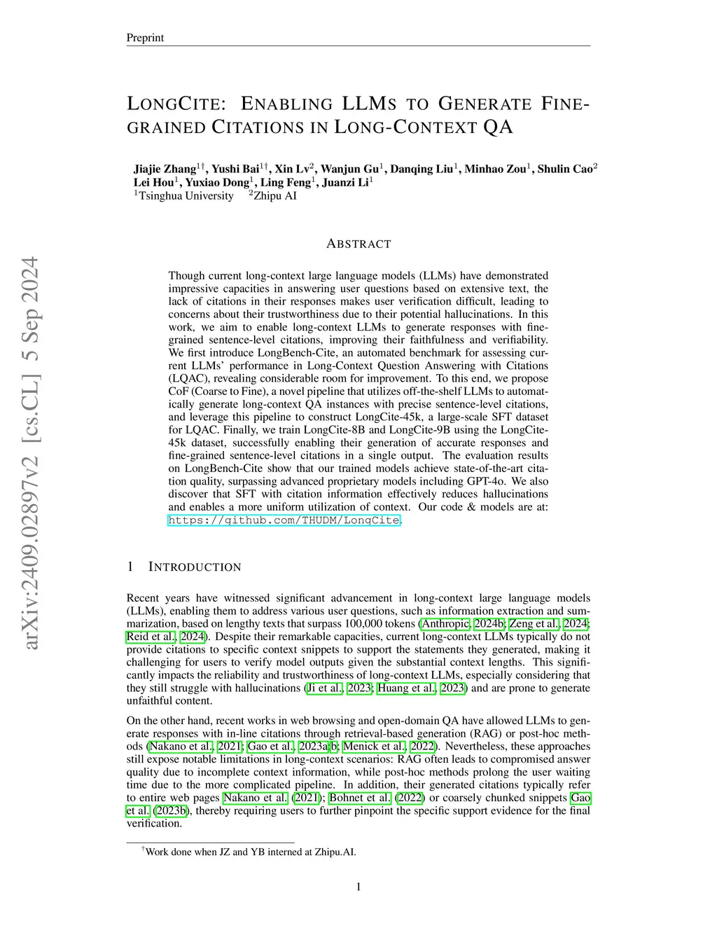LongCite: Enabling LLMs to Generate Fine-grained Citations in