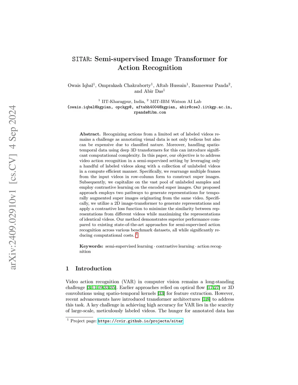 Recognizing actions from a limited set of labeled videos remains a challenge as annotating visual data is not only tedious but also can be expensive due to classified nature. Moreover, handling spatio-temporal data using deep D transformers for this can introduce significant computational complexity. In this paper, our objective is to address video action recognition in a semi-supervised setting by leveraging only a handful of labeled videos along with a collection of unlabeled videos in a compute efficient manner. Specifically, we rearrange multiple frames from the input videos in row-column form to construct super images. Subsequently, we capitalize on the vast pool of unlabeled samples and employ contrastive learning on the encoded super images. Our proposed approach employs two pathways to generate representations for temporally augmented super images originating from the same video. Specifically, we utilize a 2D image-transformer to generate representations and apply a contrastive loss function to minimize the similarity between representations from different videos while maximizing the representations of identical videos. Our method demonstrates superior performance compared to existing state-of-the-art approaches for semi-supervised action recognition across various benchmark datasets, all while significantly reducing computational costs.