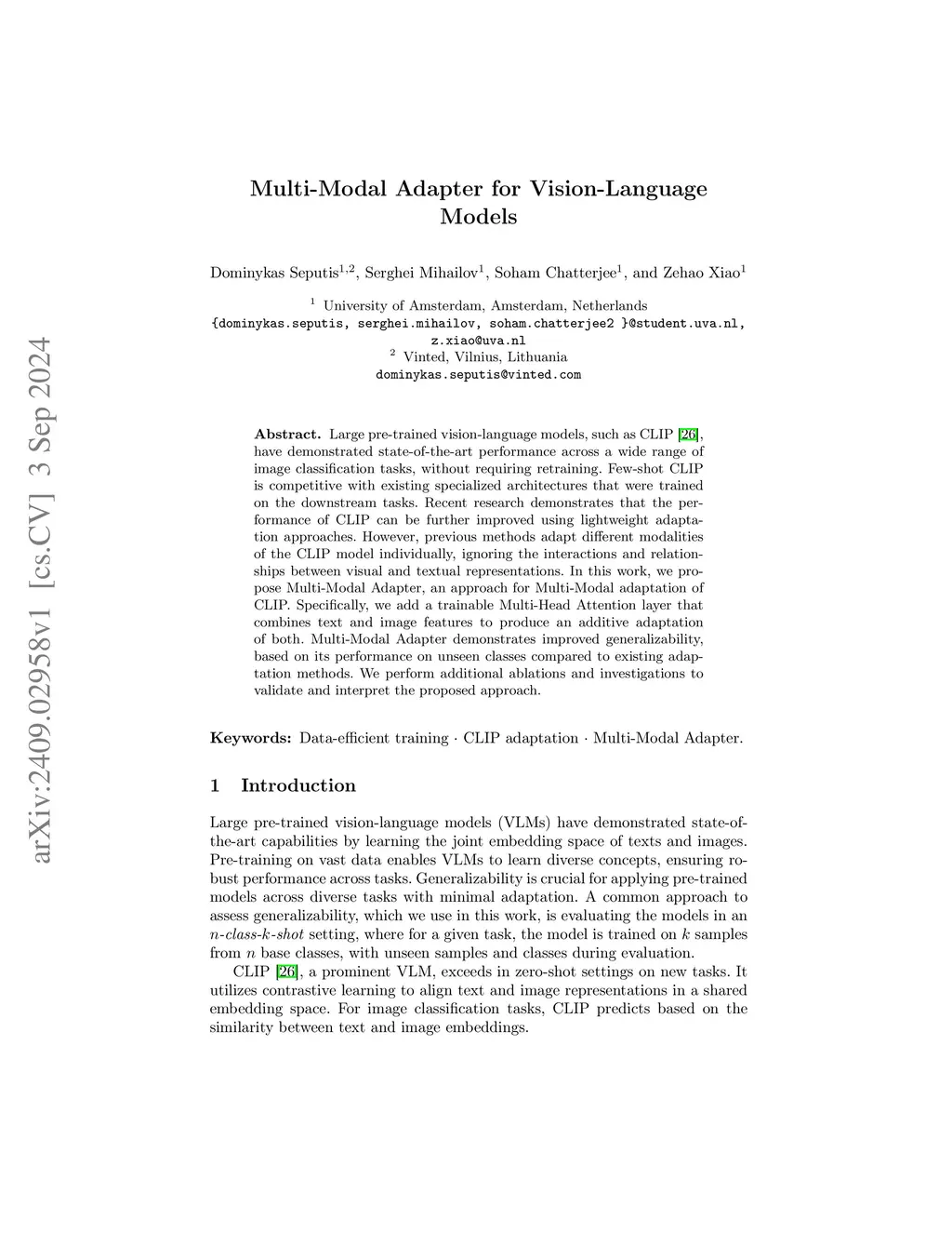 Large pre-trained vision-language models, such as CLIP, have demonstrated state-of-the-art performance across a wide range of image classification tasks, without requiring retraining. Few-shot CLIP is competitive with existing specialized architectures that were trained on the downstream tasks. Recent research demonstrates that the performance of CLIP can be further improved using lightweight adaptation approaches. However, previous methods adapt different modalities of the CLIP model individually, ignoring the interactions and relationships between visual and textual representations. In this work, we propose Multi-Modal Adapter, an approach for Multi-Modal adaptation of CLIP. Specifically, we add a trainable Multi-Head Attention layer that combines text and image features to produce an additive adaptation of both. Multi-Modal Adapter demonstrates improved generalizability, based on its performance on unseen classes compared to existing adaptation methods. We perform additional ablations and investigations to validate and interpret the proposed approach.