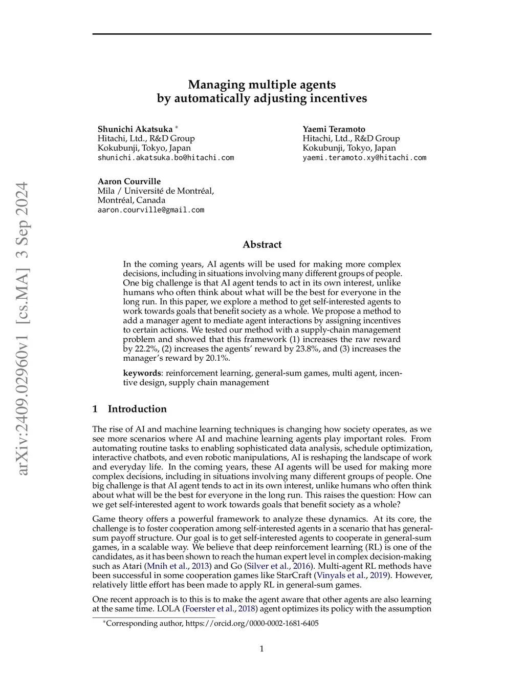 In the coming years, AI agents will be used for making more complex decisions, including in situations involving many different groups of people. One big challenge is that AI agent tends to act in its own interest, unlike humans who often think about what will be the best for everyone in the long run. In this paper, we explore a method to get self-interested agents to work towards goals that benefit society as a whole. We propose a method to add a manager agent to mediate agent interactions by assigning incentives to certain actions. We tested our method with a supply-chain management problem and showed that this framework (1) increases the raw reward by 22.2%, (2) increases the agents' reward by 23.8%, and (3) increases the manager's reward by 20.1%.