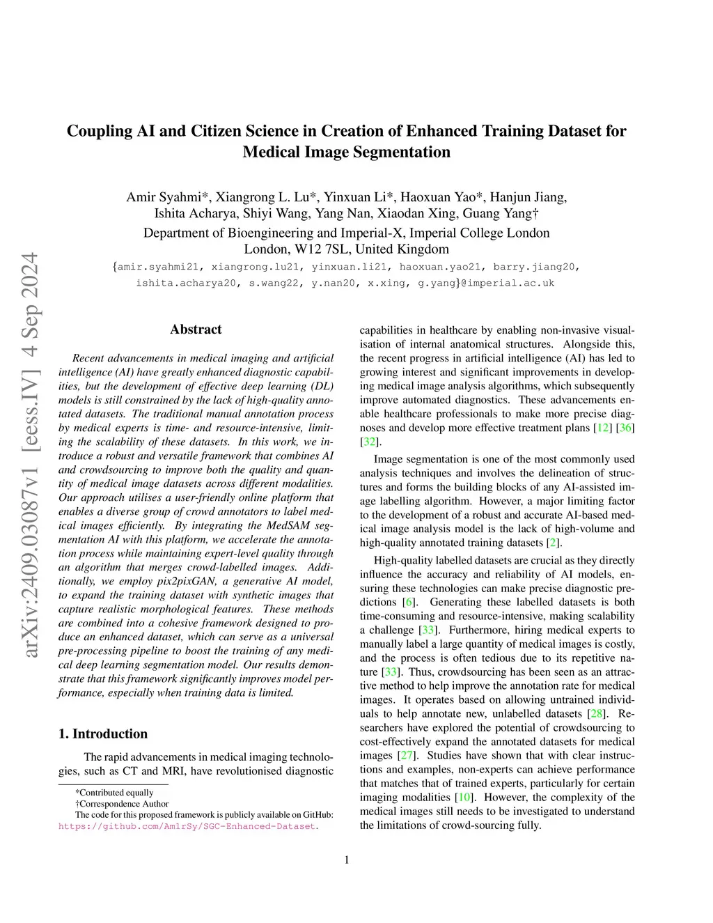 Recent advancements in medical imaging and artificial intelligence (AI) have greatly enhanced diagnostic capabilities, but the development of effective deep learning (DL) models is still constrained by the lack of high-quality annotated datasets. The traditional manual annotation process by medical experts is time- and resource-intensive, limiting the scalability of these datasets. In this work, we introduce a robust and versatile framework that combines AI and crowdsourcing to improve both the quality and quantity of medical image datasets across different modalities. Our approach utilises a user-friendly online platform that enables a diverse group of crowd annotators to label medical images efficiently. By integrating the MedSAM segmentation AI with this platform, we accelerate the annotation process while maintaining expert-level quality through an algorithm that merges crowd-labelled images. Additionally, we employ pix2pixGAN, a generative AI model, to expand the training dataset with synthetic images that capture realistic morphological features. These methods are combined into a cohesive framework designed to produce an enhanced dataset, which can serve as a universal pre-processing pipeline to boost the training of any medical deep learning segmentation model. Our results demonstrate that this framework significantly improves model performance, especially when training data is limited.