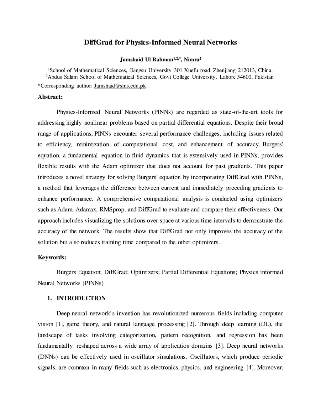 Physics-Informed Neural Networks (PINNs) are regarded as state-of-the-art tools for addressing highly nonlinear problems based on partial differential equations. Despite their broad range of applications, PINNs encounter several performance challenges, including issues related to efficiency, minimization of computational cost, and enhancement of accuracy. Burgers' equation, a fundamental equation in fluid dynamics that is extensively used in PINNs, provides flexible results with the Adam optimizer that does not account for past gradients. This paper introduces a novel strategy for solving Burgers' equation by incorporating DiffGrad with PINNs, a method that leverages the difference between current and immediately preceding gradients to enhance performance. A comprehensive computational analysis is conducted using optimizers such as Adam, Adamax, RMSprop, and DiffGrad to evaluate and compare their effectiveness. Our approach includes visualizing the solutions over space at various time intervals to demonstrate the accuracy of the network. The results show that DiffGrad not only improves the accuracy of the solution but also reduces training time compared to the other optimizers.