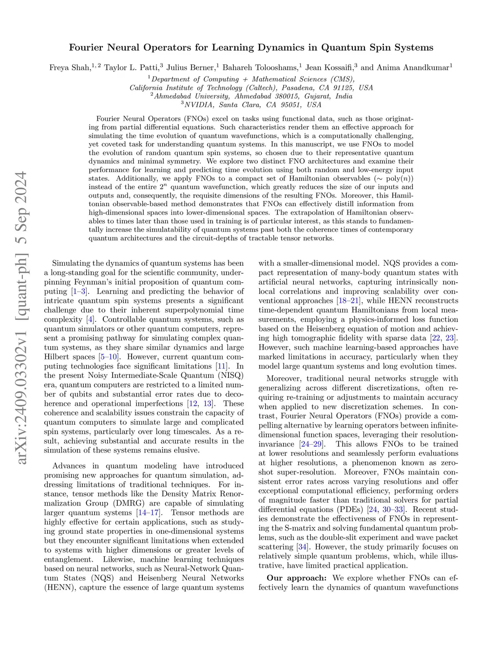 Fourier Neural Operators (FNOs) excel on tasks using functional data, such as those originating from partial differential equations. Such characteristics render them an effective approach for simulating the time evolution of quantum wavefunctions, which is a computationally challenging, yet coveted task for studying quantum systems. In this manuscript, we use FNOs to model the evolution of quantum spin systems, so chosen due to their representative quantum dynamics. We explore two distinct FNO architectures, examining their performance for learning and predicting time evolution on both random and low-energy input states. We find that standard neural networks in fixed dimensions, such as U-Net, exhibit limited ability to extrapolate beyond the training time interval, whereas FNOs reliably capture the underlying time-evolution operator, generalizing effectively to unseen times. Additionally, we apply FNOs to a compact set of Hamiltonian observables () instead of the entire quantum wavefunction, which greatly reduces the size of our FNO inputs, outputs and model dimensions. Moreover, this Hamiltonian observable-based method demonstrates that FNOs can effectively distill information from high-dimensional spaces into lower-dimensional spaces. Using this approach, we perform numerical experiments on a 20-qubit system and extrapolate Hamiltonian observables to twice the training time with a relative error of . Relative to numerical time-evolution methods, FNO achieves an inference speedup of approximately for 20-qubit systems. The extrapolation of Hamiltonian observables to times later than those used in training is of particular interest, as this stands to fundamentally increase the simulatability of quantum systems past both the coherence times of contemporary quantum architectures and the circuit-depths of tractable tensor networks.