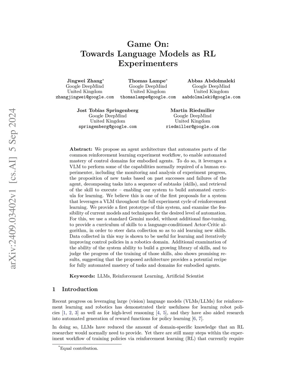 We propose an agent architecture that automates parts of the common reinforcement learning experiment workflow, to enable automated mastery of control domains for embodied agents. To do so, it leverages a VLM to perform some of the capabilities normally required of a human experimenter, including the monitoring and analysis of experiment progress, the proposition of new tasks based on past successes and failures of the agent, decomposing tasks into a sequence of subtasks (skills), and retrieval of the skill to execute - enabling our system to build automated curricula for learning. We believe this is one of the first proposals for a system that leverages a VLM throughout the full experiment cycle of reinforcement learning. We provide a first prototype of this system, and examine the feasibility of current models and techniques for the desired level of automation. For this, we use a standard Gemini model, without additional fine-tuning, to provide a curriculum of skills to a language-conditioned Actor-Critic algorithm, in order to steer data collection so as to aid learning new skills. Data collected in this way is shown to be useful for learning and iteratively improving control policies in a robotics domain. Additional examination of the ability of the system to build a growing library of skills, and to judge the progress of the training of those skills, also shows promising results, suggesting that the proposed architecture provides a potential recipe for fully automated mastery of tasks and domains for embodied agents.