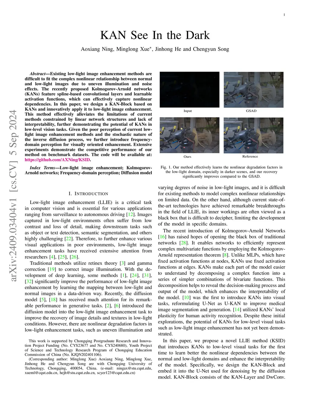 Existing low-light image enhancement methods are difficult to fit the complex nonlinear relationship between normal and low-light images due to uneven illumination and noise effects. The recently proposed Kolmogorov-Arnold networks (KANs) feature spline-based convolutional layers and learnable activation functions, which can effectively capture nonlinear dependencies. In this paper, we design a KAN-Block based on KANs and innovatively apply it to low-light image enhancement. This method effectively alleviates the limitations of current methods constrained by linear network structures and lack of interpretability, further demonstrating the potential of KANs in low-level vision tasks. Given the poor perception of current low-light image enhancement methods and the stochastic nature of the inverse diffusion process, we further introduce frequency-domain perception for visually oriented enhancement. Extensive experiments demonstrate the competitive performance of our method on benchmark datasets. The code will be available at:this https URL}{this https URL.