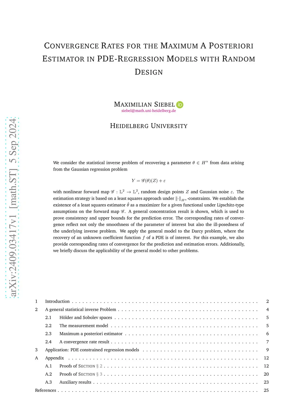 We consider the statistical inverse problem of recovering a parameter from data arising from the Gaussian regression problem \begin{equation*} Y = \mathscr{G}(\theta)(Z)+\varepsilon \end{equation*} with nonlinear forward map , random design points and Gaussian noise . The estimation strategy is based on a least squares approach under -constraints. We establish the existence of a least squares estimator as a maximizer for a given functional under Lipschitz-type assumptions on the forward map . A general concentration result is shown, which is used to prove consistency and upper bounds for the prediction error. The corresponding rates of convergence reflect not only the smoothness of the parameter of interest but also the ill-posedness of the underlying inverse problem. We apply the general model to the Darcy problem, where the recovery of an unknown coefficient function of a PDE is of interest. For this example, we also provide corresponding rates of convergence for the prediction and estimation errors. Additionally, we briefly discuss the applicability of the general model to other problems.