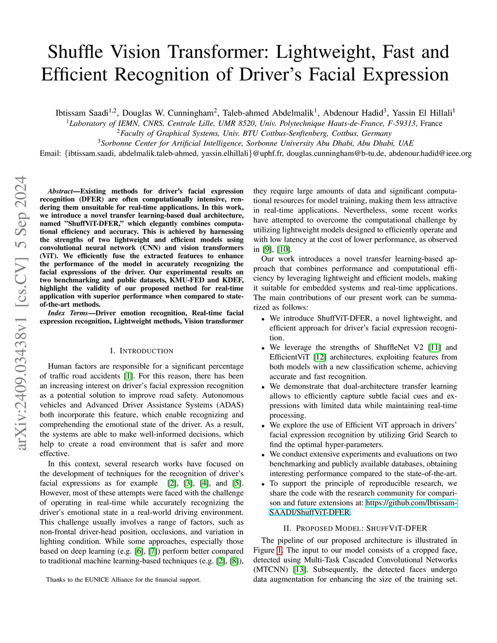 Existing methods for driver facial expression recognition (DFER) are often computationally intensive, rendering them unsuitable for real-time applications. In this work, we introduce a novel transfer learning-based dual architecture, named ShuffViT-DFER, which elegantly combines computational efficiency and accuracy. This is achieved by harnessing the strengths of two lightweight and efficient models using convolutional neural network (CNN) and vision transformers (ViT). We efficiently fuse the extracted features to enhance the performance of the model in accurately recognizing the facial expressions of the driver. Our experimental results on two benchmarking and public datasets, KMU-FED and KDEF, highlight the validity of our proposed method for real-time application with superior performance when compared to state-of-the-art methods.