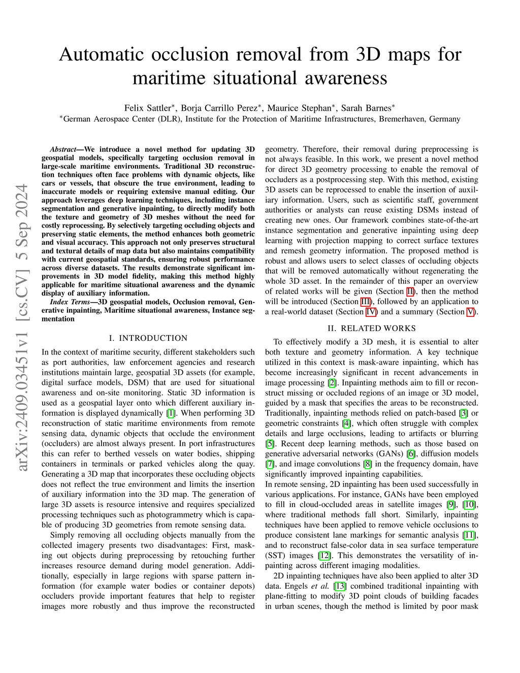 We introduce a novel method for updating 3D geospatial models, specifically targeting occlusion removal in large-scale maritime environments. Traditional 3D reconstruction techniques often face problems with dynamic objects, like cars or vessels, that obscure the true environment, leading to inaccurate models or requiring extensive manual editing. Our approach leverages deep learning techniques, including instance segmentation and generative inpainting, to directly modify both the texture and geometry of 3D meshes without the need for costly reprocessing. By selectively targeting occluding objects and preserving static elements, the method enhances both geometric and visual accuracy. This approach not only preserves structural and textural details of map data but also maintains compatibility with current geospatial standards, ensuring robust performance across diverse datasets. The results demonstrate significant improvements in 3D model fidelity, making this method highly applicable for maritime situational awareness and the dynamic display of auxiliary information.