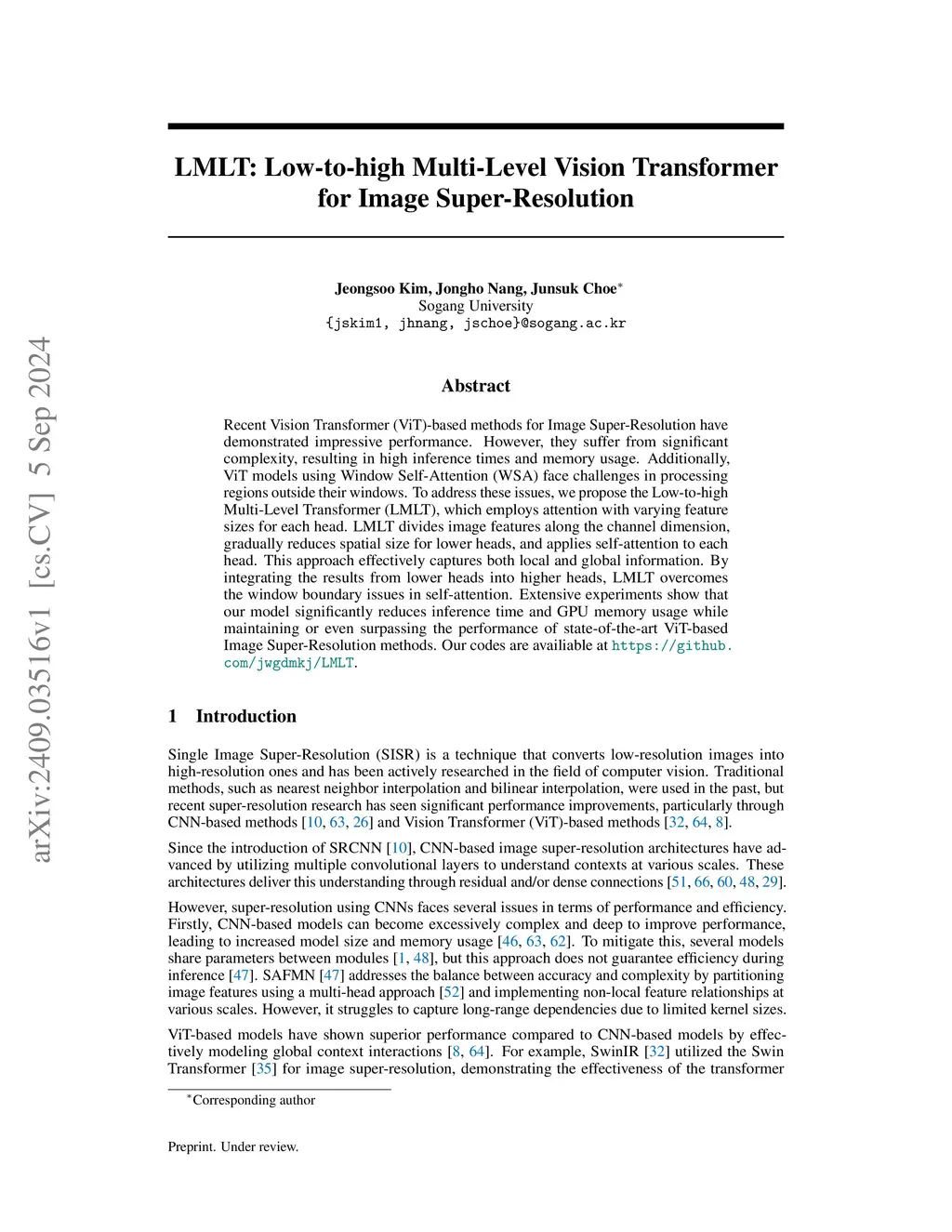 Recent Vision Transformer (ViT)-based methods for Image Super-Resolution have demonstrated impressive performance. However, they suffer from significant complexity, resulting in high inference times and memory usage. Additionally, ViT models using Window Self-Attention (WSA) face challenges in processing regions outside their windows. To address these issues, we propose the Low-to-high Multi-Level Transformer (LMLT), which employs attention with varying feature sizes for each head. LMLT divides image features along the channel dimension, gradually reduces spatial size for lower heads, and applies self-attention to each head. This approach effectively captures both local and global information. By integrating the results from lower heads into higher heads, LMLT overcomes the window boundary issues in self-attention. Extensive experiments show that our model significantly reduces inference time and GPU memory usage while maintaining or even surpassing the performance of state-of-the-art ViT-based Image Super-Resolution methods. Our codes are availiable at https://github.com/jwgdmkj/LMLT.