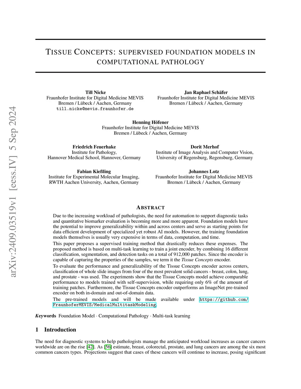 Due to the increasing workload of pathologists, the need for automation to support diagnostic tasks and quantitative biomarker evaluation is becoming more and more apparent. Foundation models have the potential to improve generalizability within and across centers and serve as starting points for data efficient development of specialized yet robust AI models. However, the training foundation models themselves is usually very expensive in terms of data, computation, and time. This paper proposes a supervised training method that drastically reduces these expenses. The proposed method is based on multi-task learning to train a joint encoder, by combining 16 different classification, segmentation, and detection tasks on a total of 912,000 patches. Since the encoder is capable of capturing the properties of the samples, we term it the Tissue Concepts encoder. To evaluate the performance and generalizability of the Tissue Concepts encoder across centers, classification of whole slide images from four of the most prevalent solid cancers - breast, colon, lung, and prostate - was used. The experiments show that the Tissue Concepts model achieve comparable performance to models trained with self-supervision, while requiring only 6% of the amount of training patches. Furthermore, the Tissue Concepts encoder outperforms an ImageNet pre-trained encoder on both in-domain and out-of-domain data.