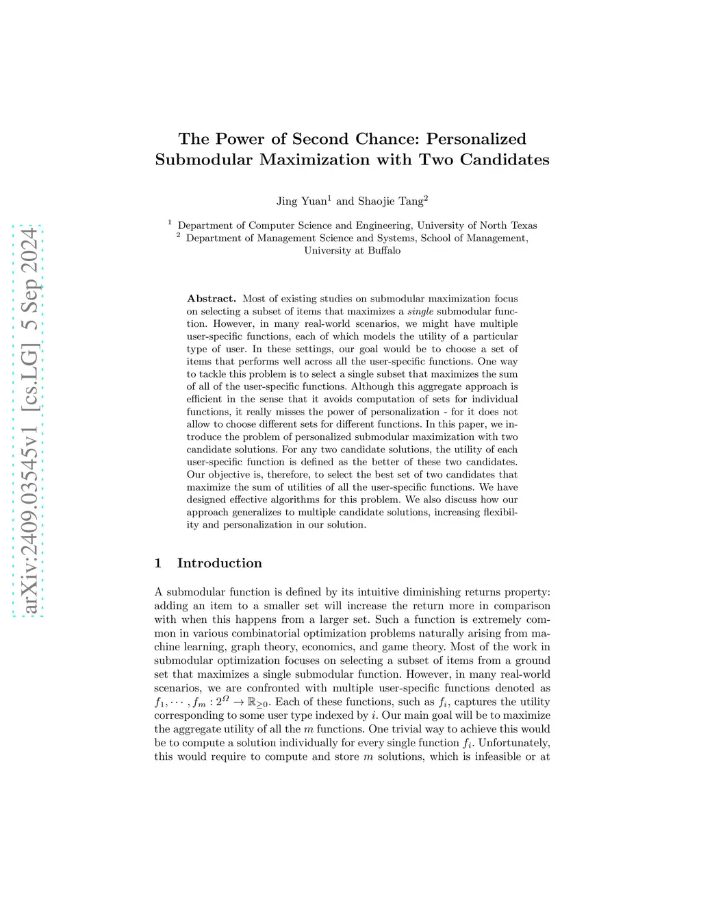Most of existing studies on submodular maximization focus on selecting a subset of items that maximizes a \emph{single} submodular function. However, in many real-world scenarios, we might have multiple user-specific functions, each of which models the utility of a particular type of user. In these settings, our goal would be to choose a set of items that performs well across all the user-specific functions. One way to tackle this problem is to select a single subset that maximizes the sum of all of the user-specific functions. Although this aggregate approach is efficient in the sense that it avoids computation of sets for individual functions, it really misses the power of personalization - for it does not allow to choose different sets for different functions. In this paper, we introduce the problem of personalized submodular maximization with two candidate solutions. For any two candidate solutions, the utility of each user-specific function is defined as the better of these two candidates. Our objective is, therefore, to select the best set of two candidates that maximize the sum of utilities of all the user-specific functions. We have designed effective algorithms for this problem. We also discuss how our approach generalizes to multiple candidate solutions, increasing flexibility and personalization in our solution.