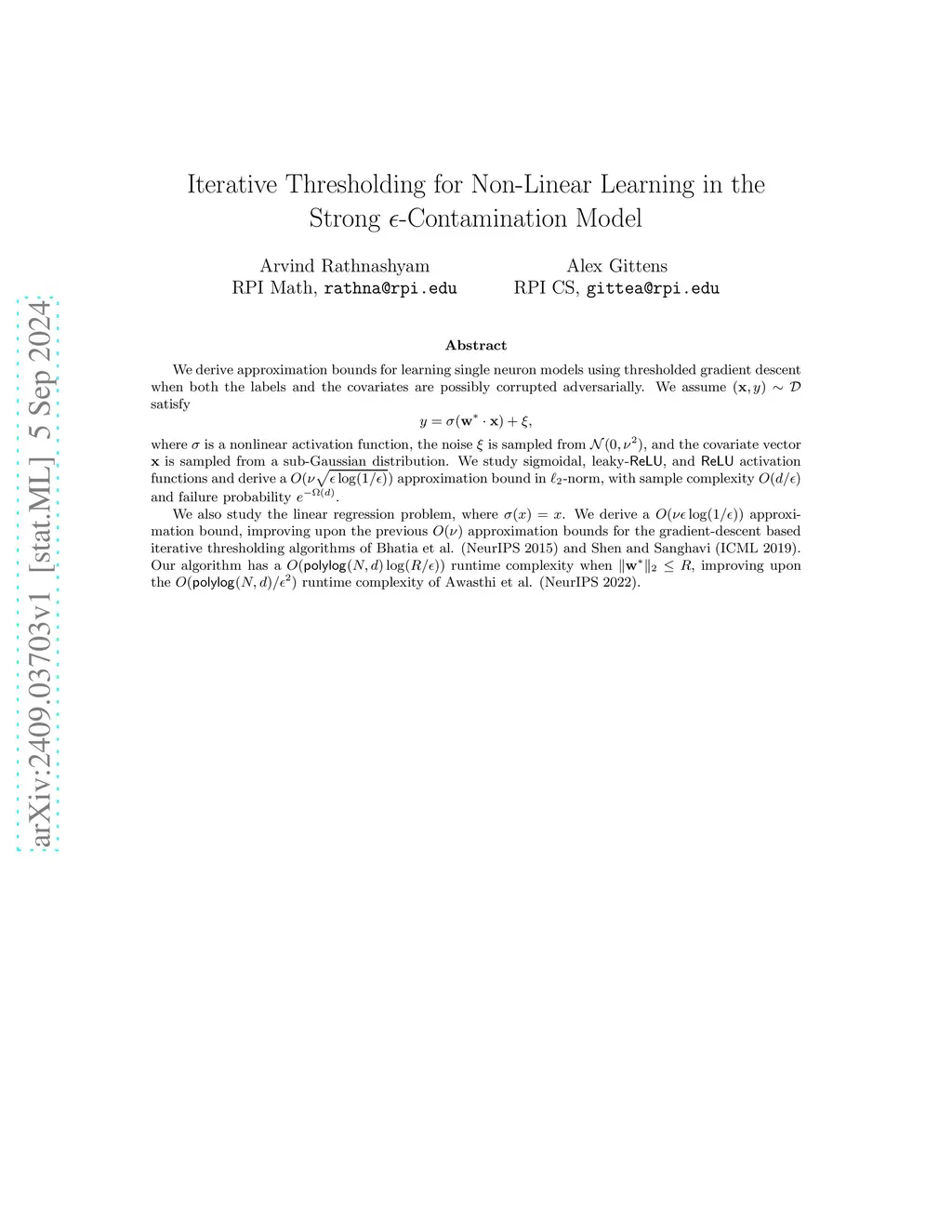 We derive approximation bounds for learning single neuron models using thresholded gradient descent when both the labels and the covariates are possibly corrupted adversarially. We assume the data follows the model where is a nonlinear activation function, the noise is Gaussian, and the covariate vector is sampled from a sub-Gaussian distribution. We study sigmoidal, leaky-ReLU, and ReLU activation functions and derive a approximation bound in -norm, with sample complexity and failure probability . We also study the linear regression problem, where . We derive a approximation bound, improving upon the previous approximation bounds for the gradient-descent based iterative thresholding algorithms of Bhatia et al. (NeurIPS 2015) and Shen and Sanghavi (ICML 2019). Our algorithm has a runtime complexity when , improving upon the runtime complexity of Awasthi et al. (NeurIPS 2022).