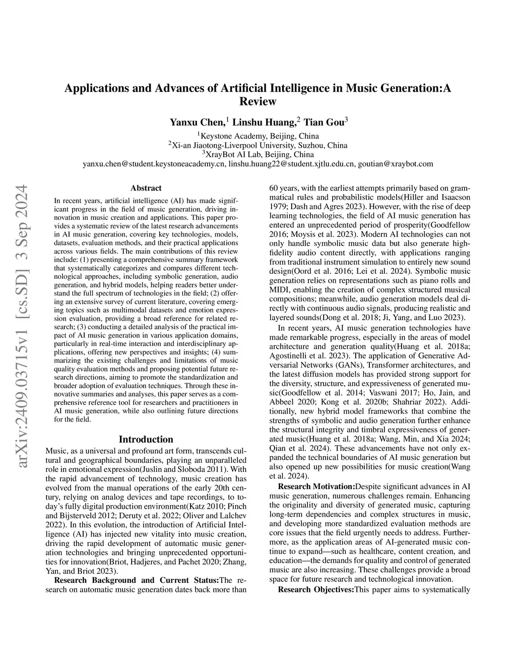In recent years, artificial intelligence (AI) has made significant progress in the field of music generation, driving innovation in music creation and applications. This paper provides a systematic review of the latest research advancements in AI music generation, covering key technologies, models, datasets, evaluation methods, and their practical applications across various fields. The main contributions of this review include: (1) presenting a comprehensive summary framework that systematically categorizes and compares different technological approaches, including symbolic generation, audio generation, and hybrid models, helping readers better understand the full spectrum of technologies in the field; (2) offering an extensive survey of current literature, covering emerging topics such as multimodal datasets and emotion expression evaluation, providing a broad reference for related research; (3) conducting a detailed analysis of the practical impact of AI music generation in various application domains, particularly in real-time interaction and interdisciplinary applications, offering new perspectives and insights; (4) summarizing the existing challenges and limitations of music quality evaluation methods and proposing potential future research directions, aiming to promote the standardization and broader adoption of evaluation techniques. Through these innovative summaries and analyses, this paper serves as a comprehensive reference tool for researchers and practitioners in AI music generation, while also outlining future directions for the field.