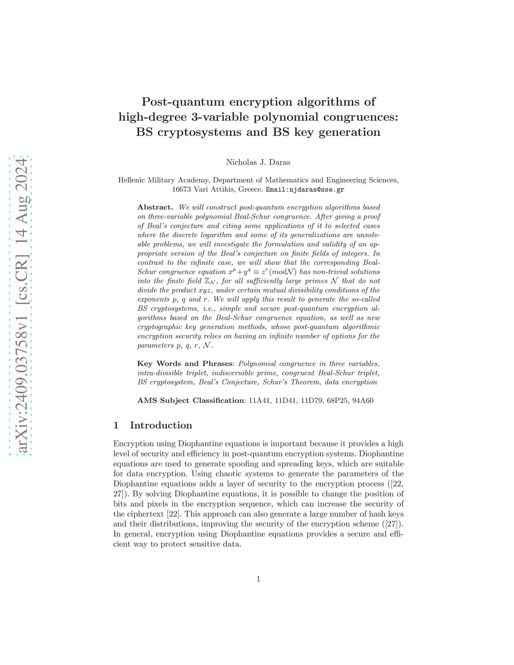 We will construct post-quantum encryption algorithms based on three-variable polynomial Beal-Schur congruence. After giving a proof of Beal's conjecture and citing some applications of it to selected cases where the discrete logarithm and some of its generalizations are unsolvable problems, we will investigate the formulation and validity of an appropriate version of the Beal's conjecture on finite fields of integers. In contrast to the infinite case, we will show that the corresponding Beal-Schur congruence equation has non-trivial solutions into the finite field $\mathbb{Z}_{\mathcal{N}} $, for all sufficiently large primes that do not divide the product , under certain mutual divisibility conditions of the exponents , and . We will apply this result to generate the so-called BS cryptosystems, i.e., simple and secure post-quantum encryption algorithms based on the Beal-Schur congruence equation, as well as new cryptographic key generation methods, whose post-quantum algorithmic encryption security relies on having an infinite number of options for the parameters , , , .
