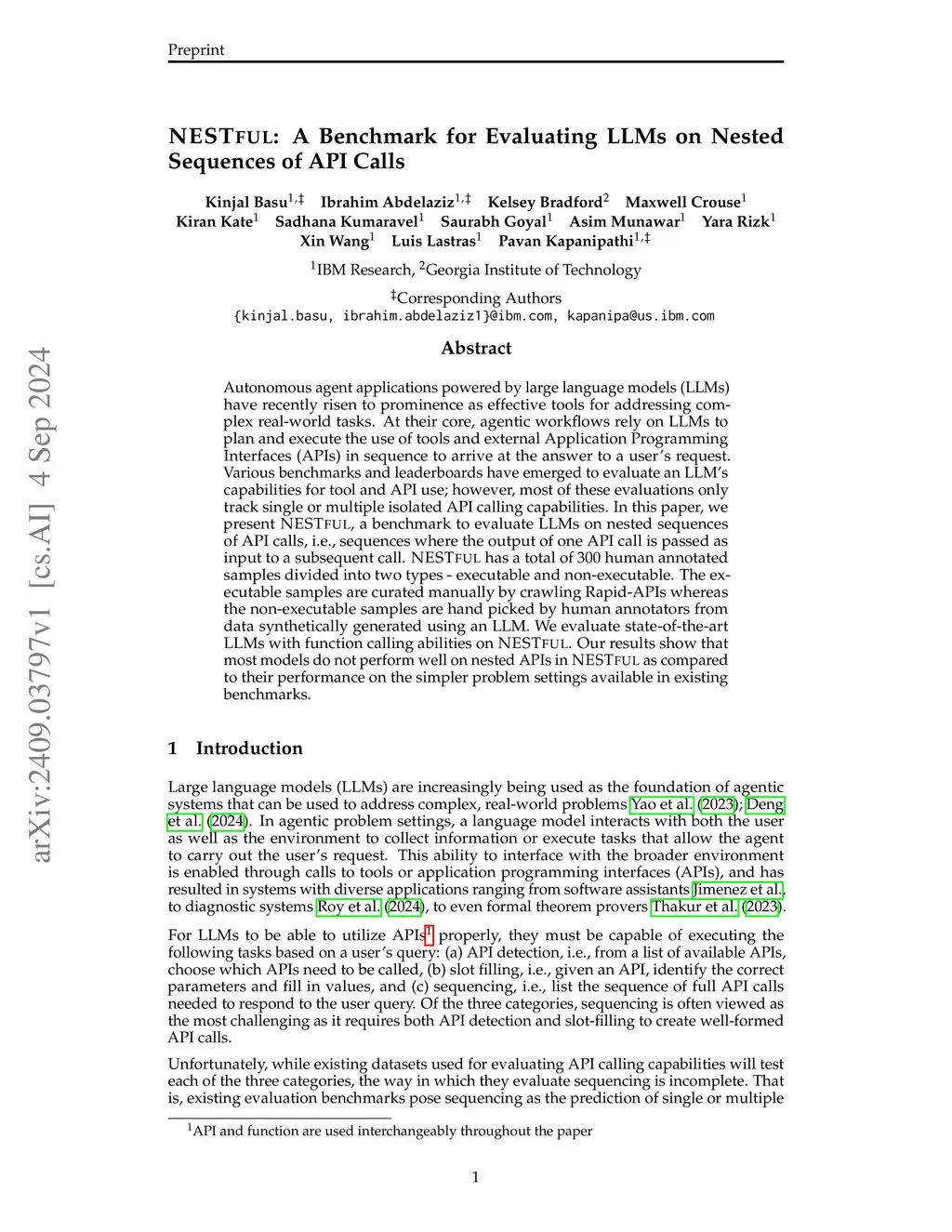 The resurgence of autonomous agents built using large language models (LLMs) to solve complex real-world tasks has brought increased focus on LLMs' fundamental ability of tool or function calling. At the core of these agents, an LLM must plan, execute, and respond using external tools, APIs, and custom functions. Research on tool calling has gathered momentum, but evaluation benchmarks and datasets representing the complexity of the tasks have lagged behind. In this work, we focus on one such complexity, nested sequencing, with the goal of extending existing benchmarks and evaluation. Specifically, we present NESTFUL, a benchmark to evaluate LLMs on nested sequences of API calls, i.e., sequences where the output of one API call is passed as input to a subsequent call. NESTFUL contains 1800+ nested sequences where all the function calls are executable. Experimental results on a variety of models show that the best-performing model (GPT-4o) achieves a full sequence match accuracy of 28% and a win-rate of 60%, necessitating a large scope for improvement in the nested sequencing aspect of function calling. Our analysis of these results provides possible future research directions for the community, in addition to a benchmark to track progress. We have released the NESTFUL dataset under the Apache 2.0 license atthis https URL.